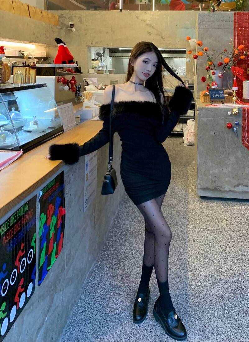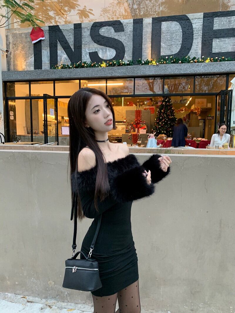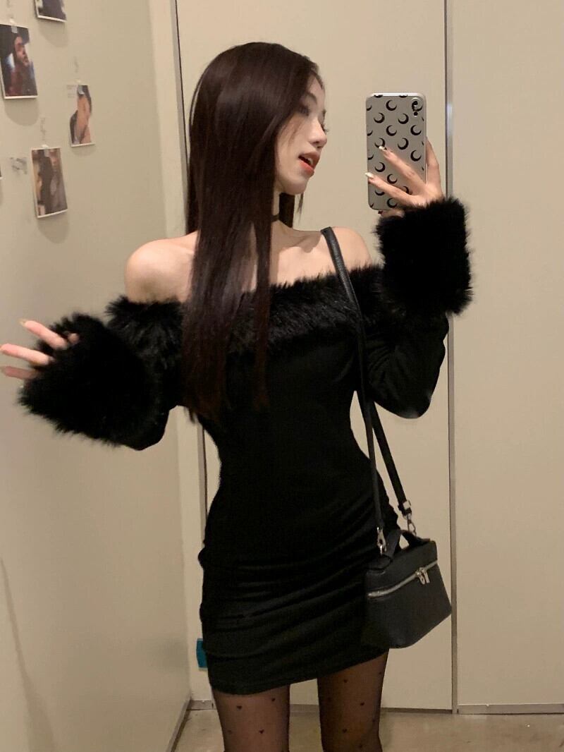 冬のワンショルダーの毛皮のようなドレスの女性、ウエストを締める、タイトフィットの黒いスカート、純粋な欲望のスタイル、セクシーなお尻を覆うボトムスカート ブラック ウィンター 冬物 ピュア berry47489746993 | beaute25
