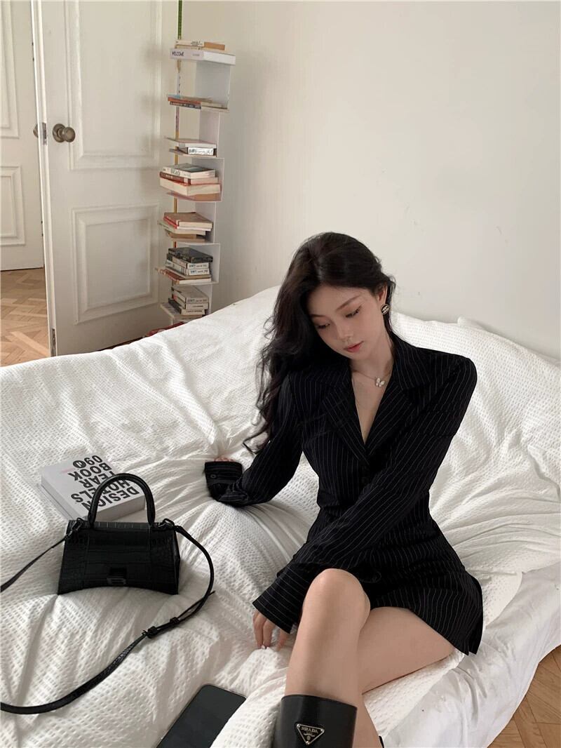 黒ストライプ長袖シャツ女性早春 2024 新しい気質スリム V ネックシャツウエストミッドレングストップ ロング ブラック スプリング 春物 Vネック berry12191287822 | beaute25