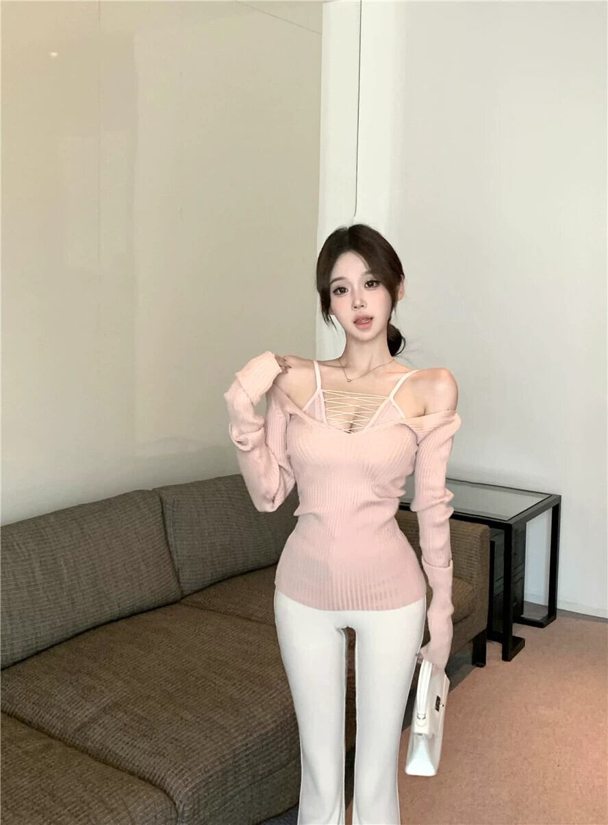 春先のオフショルダーの深い V ネックのセーターの女性、純粋な欲望のスタイル、内側にピンクのトップが付いたセクシーなスリムな長袖のボトムス セーター ロング スプリング 春物 Vネック ピュア berry88557428956 | beaute25