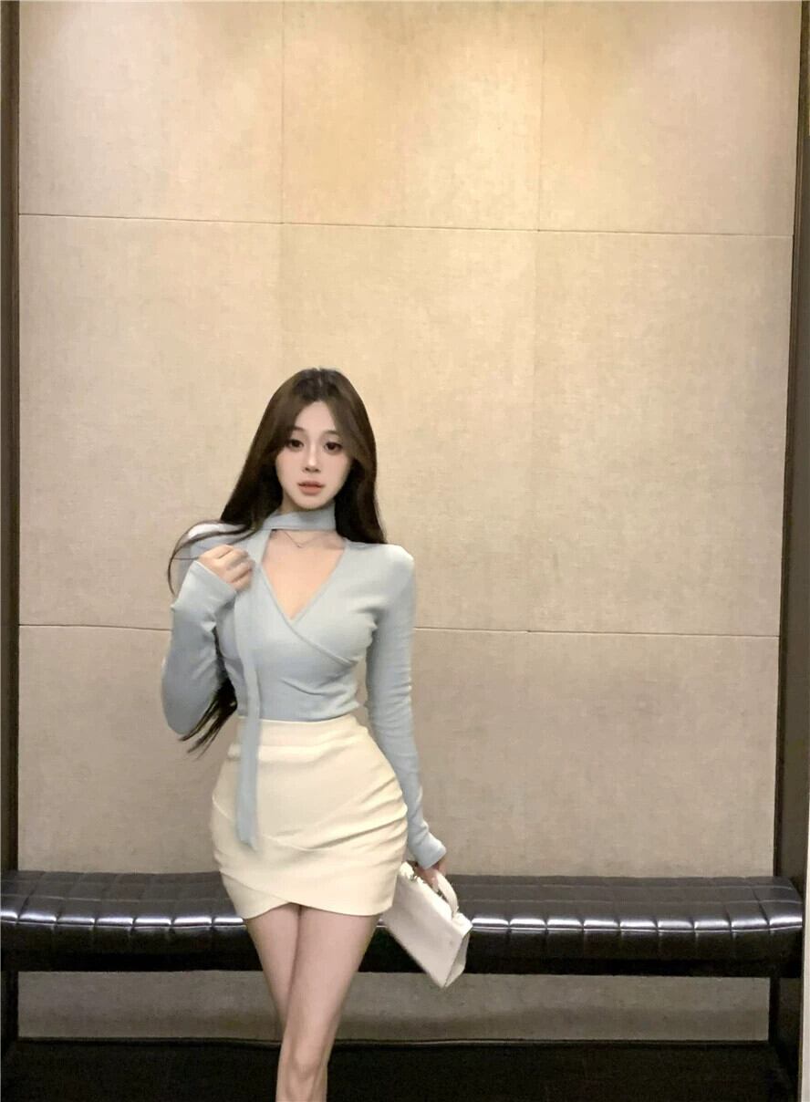 純粋な欲望スタイルのレースアップ V ネック T シャツ女性春ブルーウエストを締める気質タイトフィットインナー長袖ショートボトムシャツトップ ロング スプリング 春物 Vネック Tシャツ berry88669628670 | beaute25