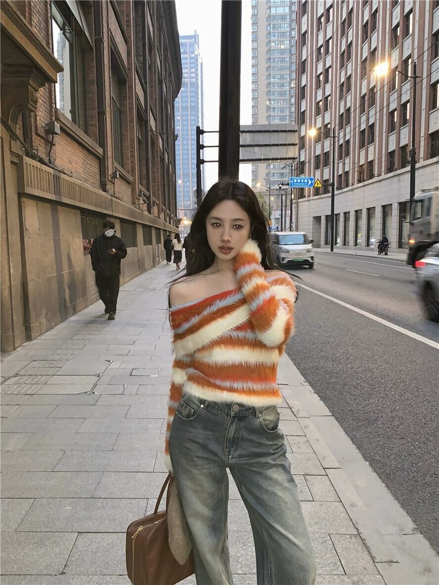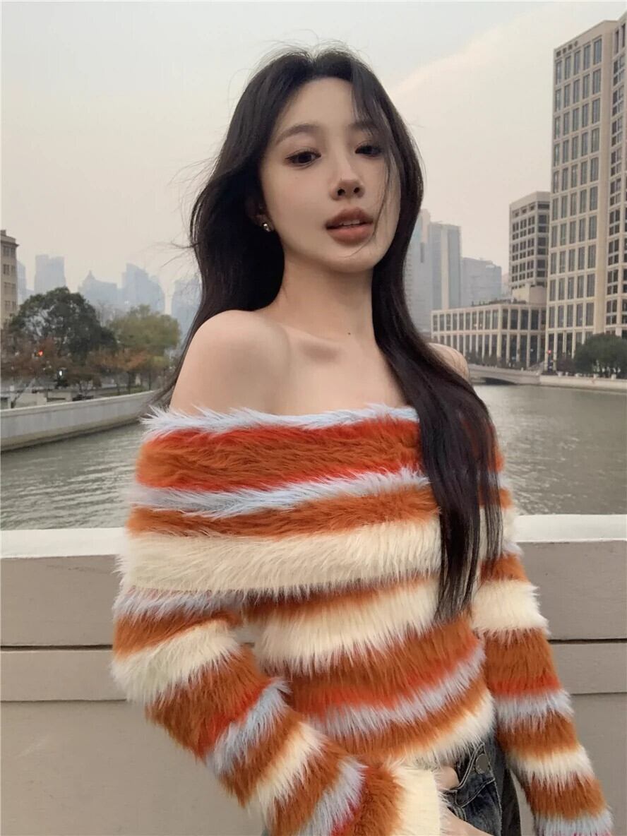 ワンショルダー カラフル ストライプ セーター レディース 春 スリム フィット レトロ ソフト ワックス ファー インナー セーター 長袖 トップ ロング スプリング 春物 berry84718591963 | beaute25