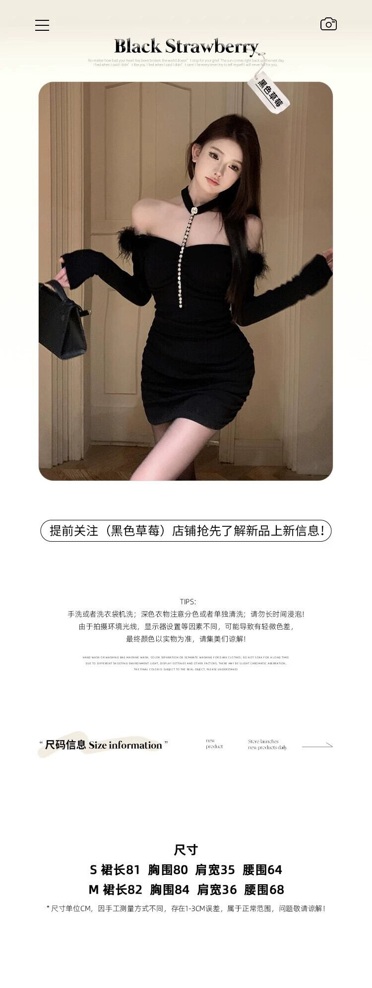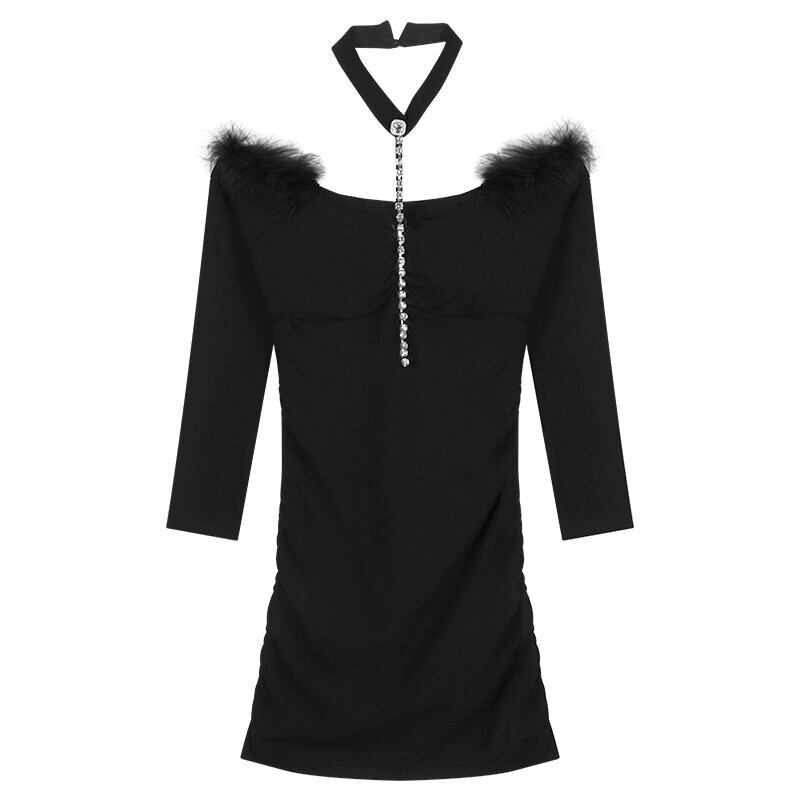 ワンショルダーダイヤモンドがちりばめられたホルターネック長袖ドレス女性春タイトヒップハグショートスカート純粋な貪欲なスタイル黒のセクシーなスカート ロング ブラック スプリング 春物 ピュア berry57277516309 | beaute25