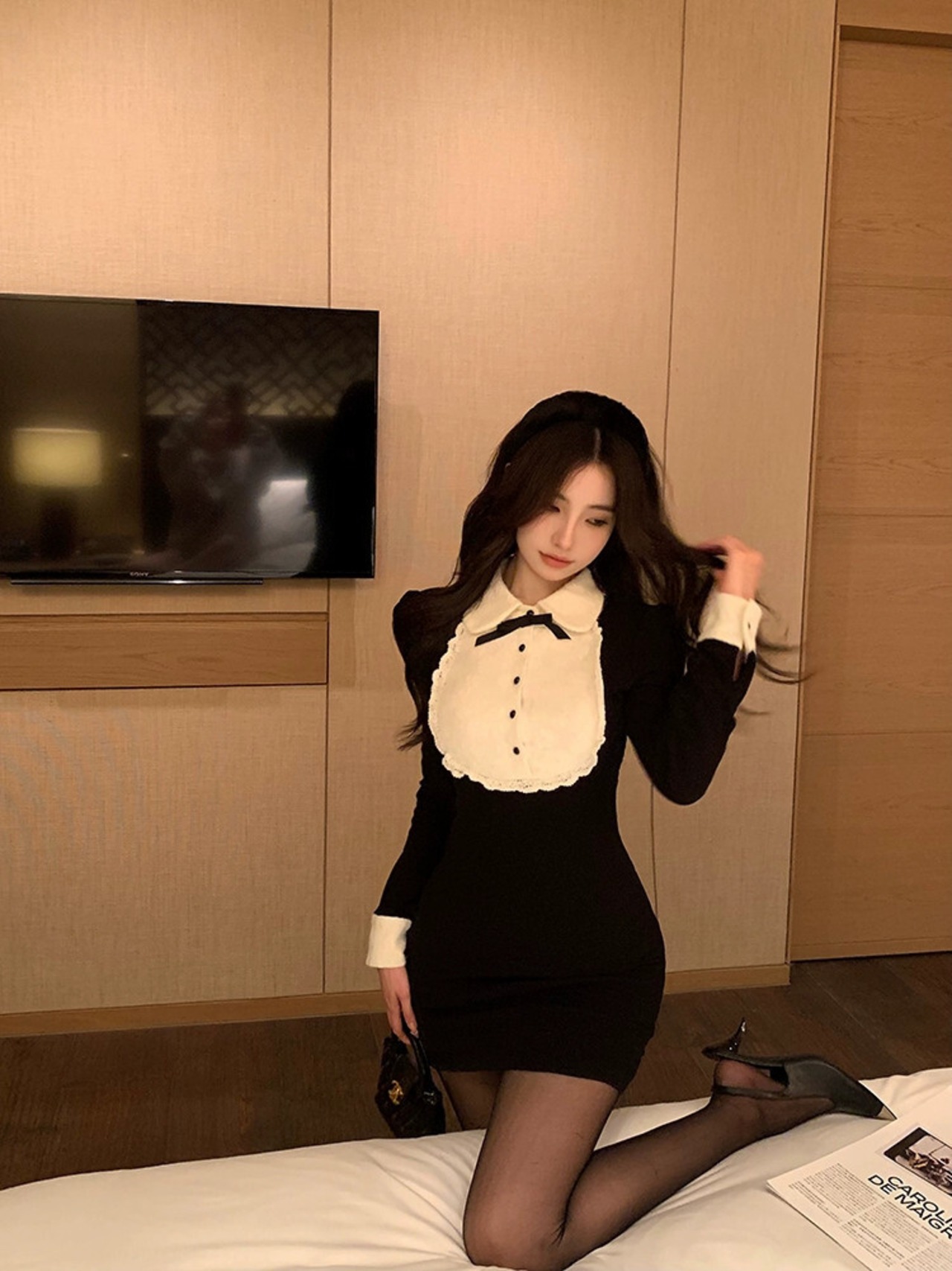 春の黒と白のコントラストカラーの長袖ドレス、ウエストを締める、お尻を覆うタイトフィットのショートスカート、純粋な欲望のスタイル、リッチなゴールドの感触のスリムフィットスカート ロング ホワイト ブラック スプリング 春物 ピュア berry56106644666 | beaute25