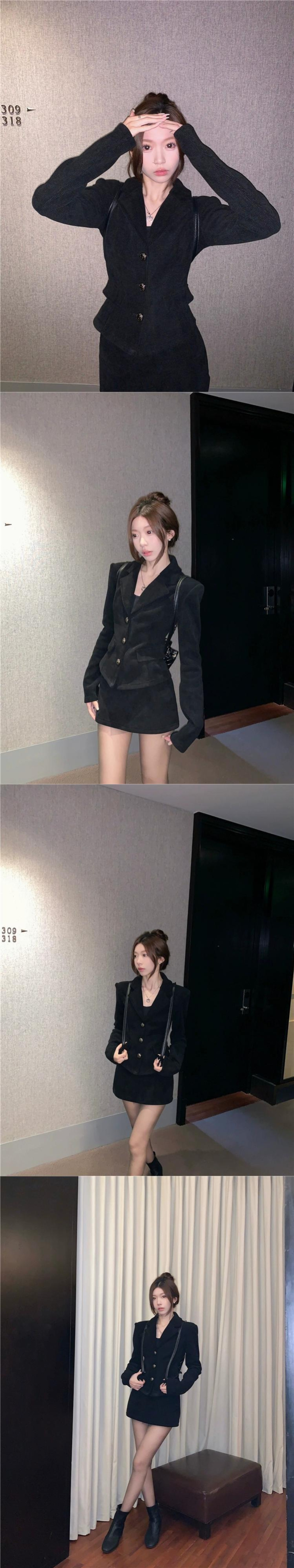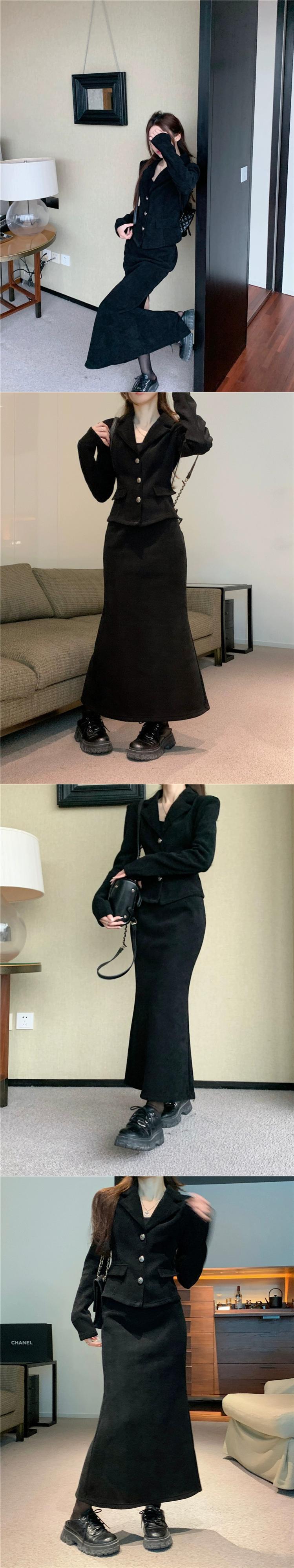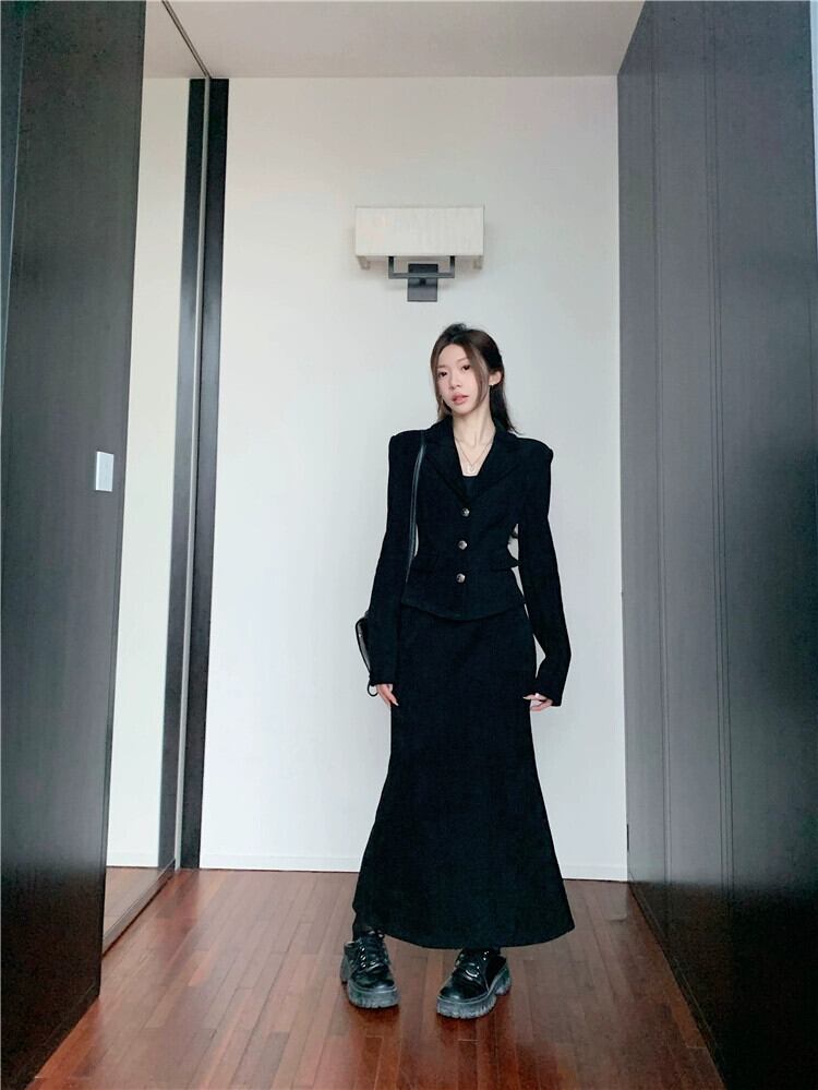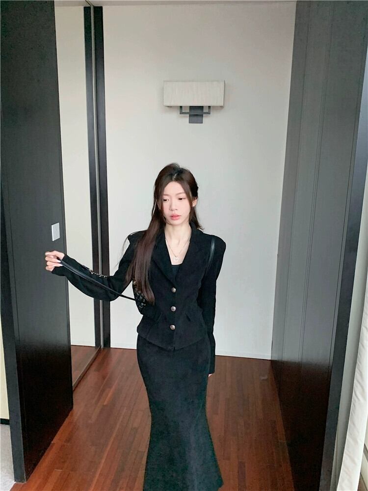 黒の高級ベルベットスーツジャケット、小さな香りのスーツ、女性の秋冬のフィッシュテールスカート、ロングスカートの2点セット ブラック オータム 秋物 ウィンター 冬物 berry26224348995 | beaute25