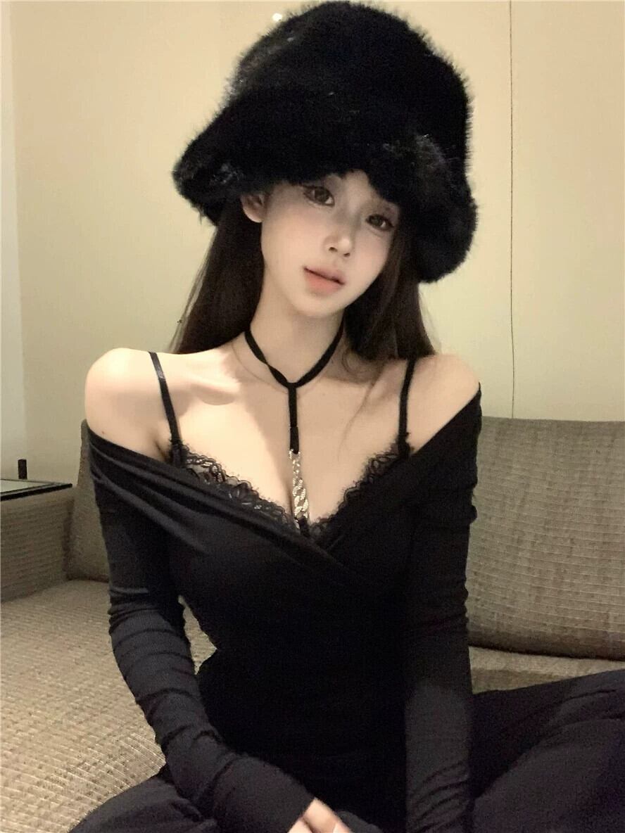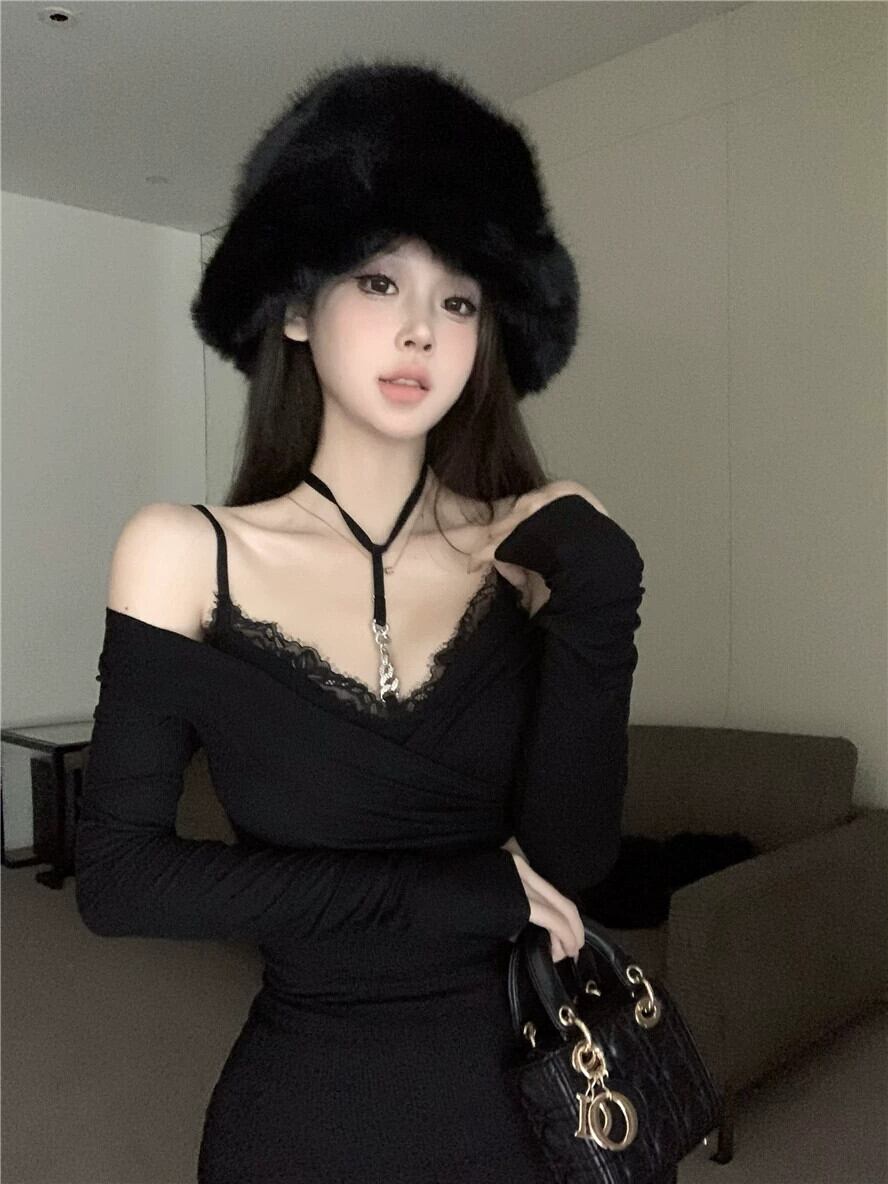 セクシーなオフショルダー V ネック長袖 Tシャツ女性春 2024 新しいスタイルウエストタイトなインナーと黒の底シャツトップ ロング ブラック スプリング 春物 Vネック berry8142301873 | beaute25