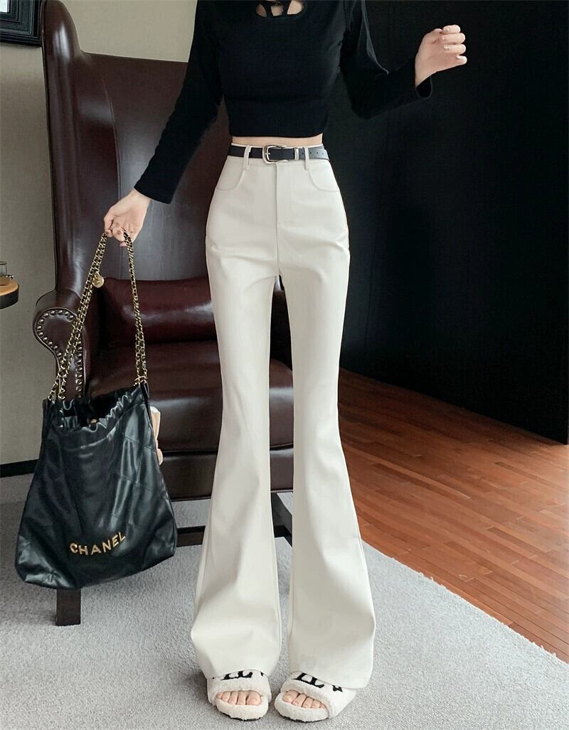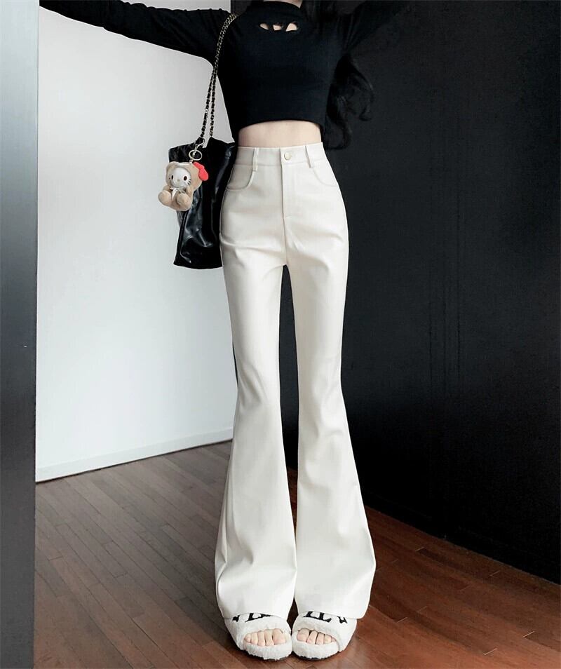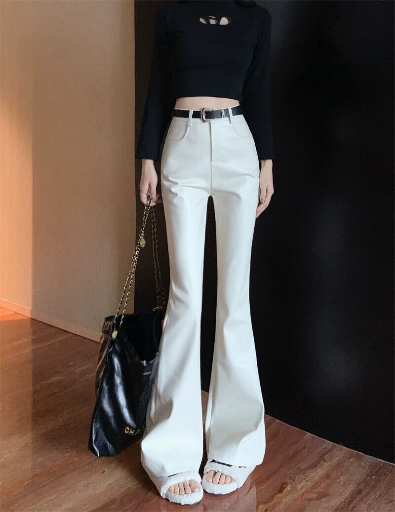 マイクロフレア PU レザー パンツ レディース、春ハイウエスト ストレート パンツ、ホワイト スリム フィット フレア パンツ、カジュアル フロアレングス ホースシュー パンツ レッド スプリング 春物 berry18589173704 | beaute25
