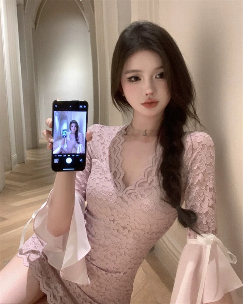 ロイヤルシスタースタイルのセクシーなvネックレースドレス女性の夏の痩身ヒップハグショートスカート純粋な欲望気質aラインスカート サマー 夏物 ピュア berry22277060614 | beaute25