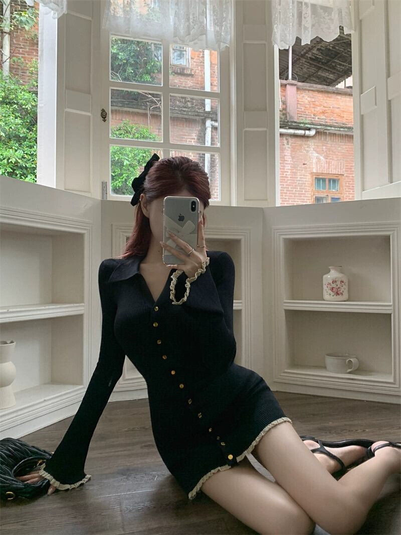 熱い気質長袖ラペルニットドレス女性の秋と冬のスプライシングレースブラックスカートスリムヒップハグショートスカート ロング オータム 秋物 ウィンター 冬物 berry99665180461 | beaute25
