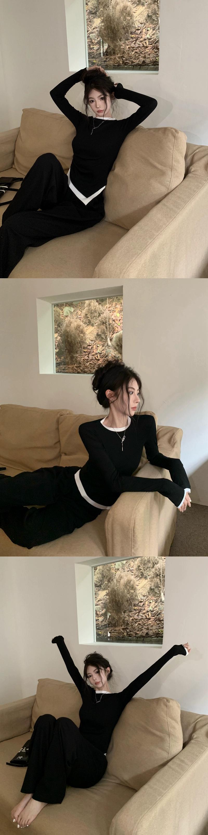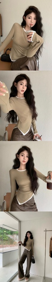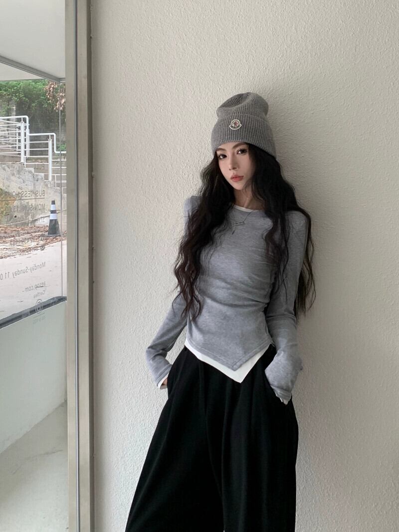 グレー長袖 T シャツの女性の春デザイン ステッチ スリム フィット インナー不規則なフェイク ツーピース トップ ボトリング シャツ ロング スプリング 春物 Tシャツ berry14611701195 | beaute25