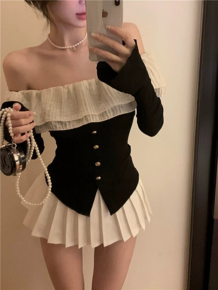 フランスのワンショルダー長袖 T シャツの女性の春の純粋な欲望スタイルのフリルのパッチワークウエスト痩身とシックなトップ ロング スプリング 春物 Tシャツ ピュア berry47571574710 | beaute25