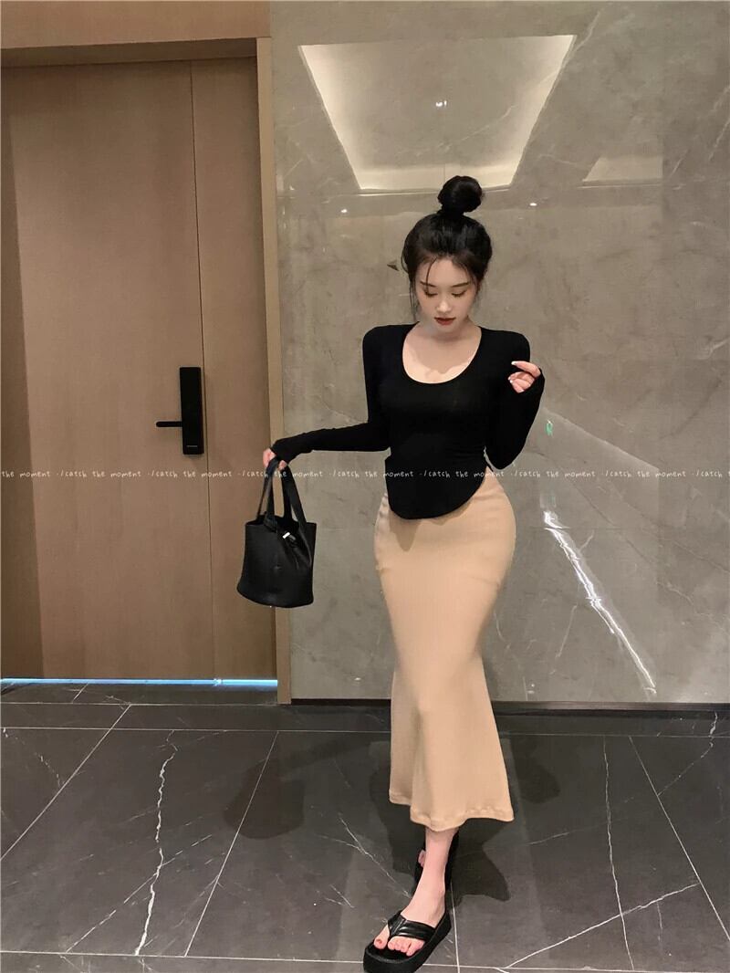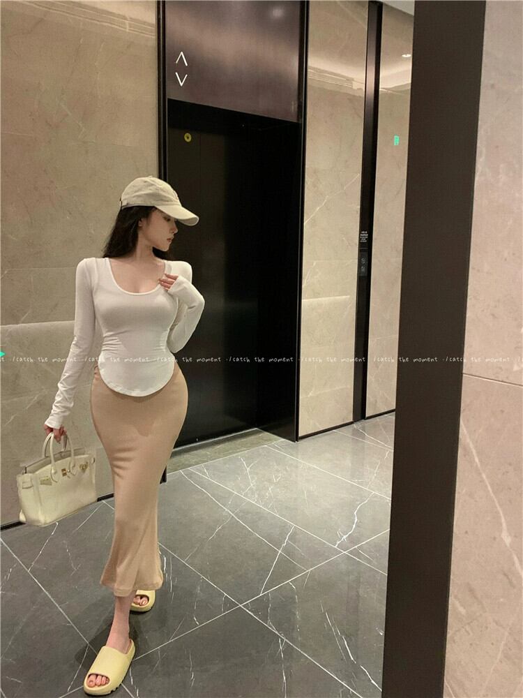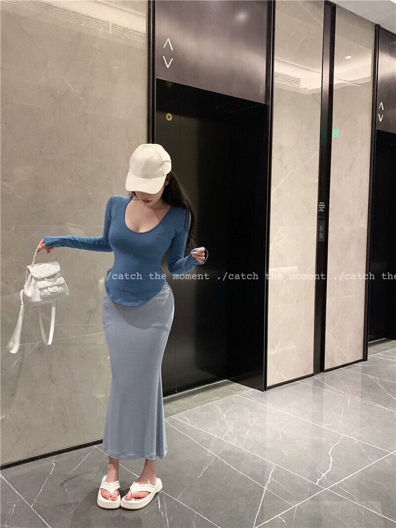 Pure Desire ホットガール U ネック薄い長袖 Tシャツ女性の春ショートカーブ裾スリムフィットボトリングシャツトップ ロング スプリング 春物 berry60516342777 | beaute25