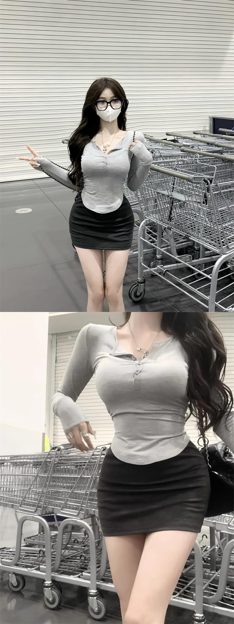 色:ネイビーブルーのTシャツ,グレーティー,ピンクティー,ダークグレーのヒップスカート