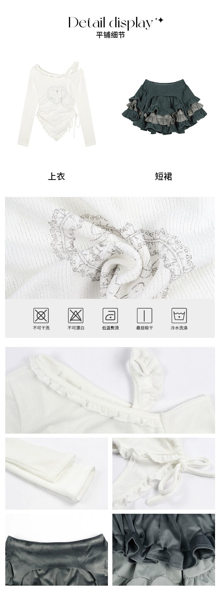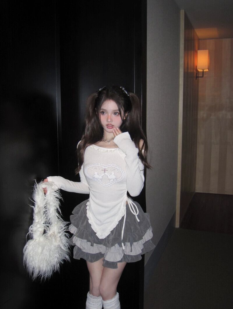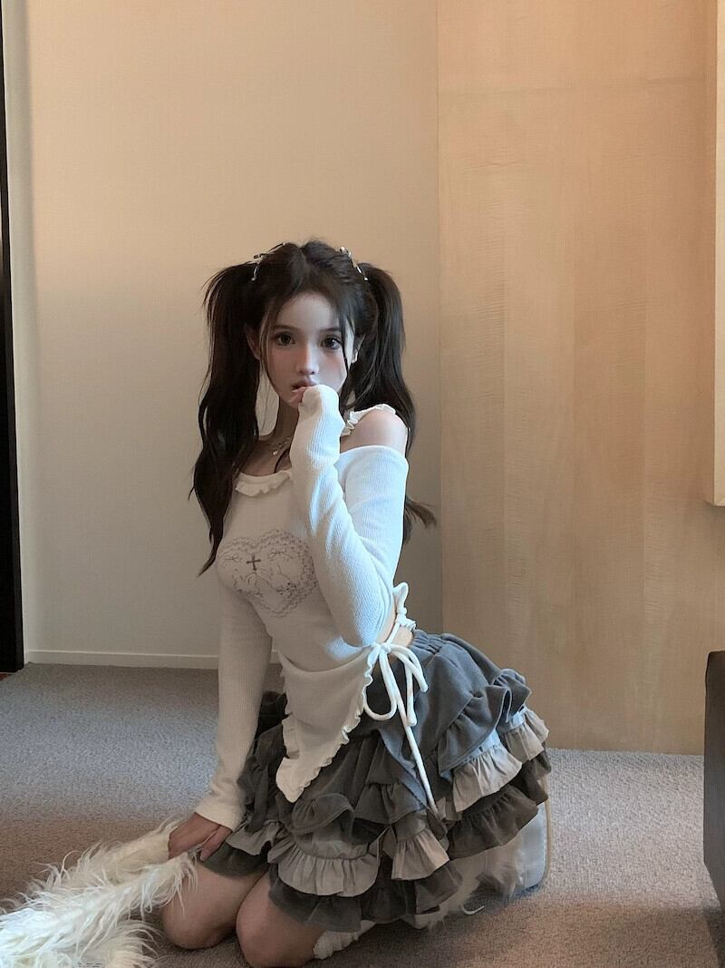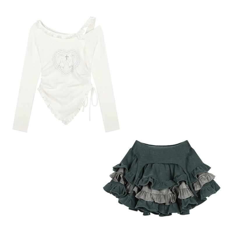 甘辛プチプリントTシャツレディース春タイトフィット不規則な耳型長袖オフショルダートップス ロング 大人ガーリー スウィート キュート カジュアル スプリング 春物 berry99864377771 | beaute25