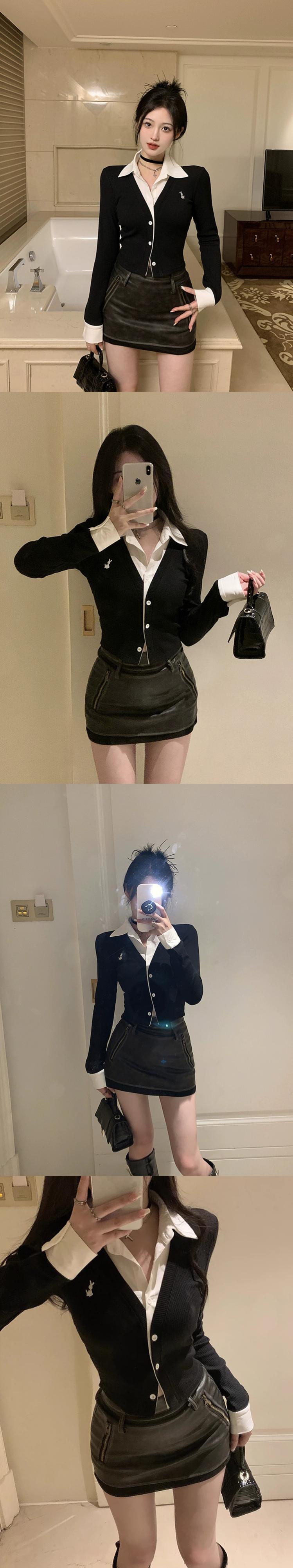 ポロカラー刺繍長袖ニットカーディガンレディース春カレッジスタイルシャツパッチワークスリムショートフェイクツーピーストップ ロング レッド スプリング 春物 berry31380618268 | beaute25