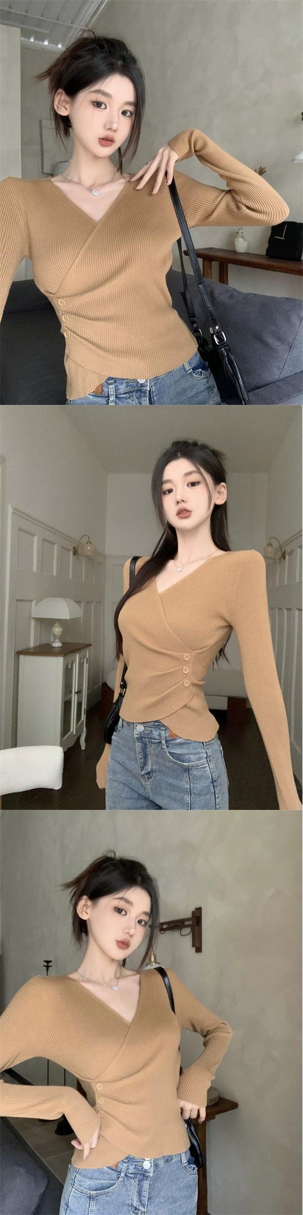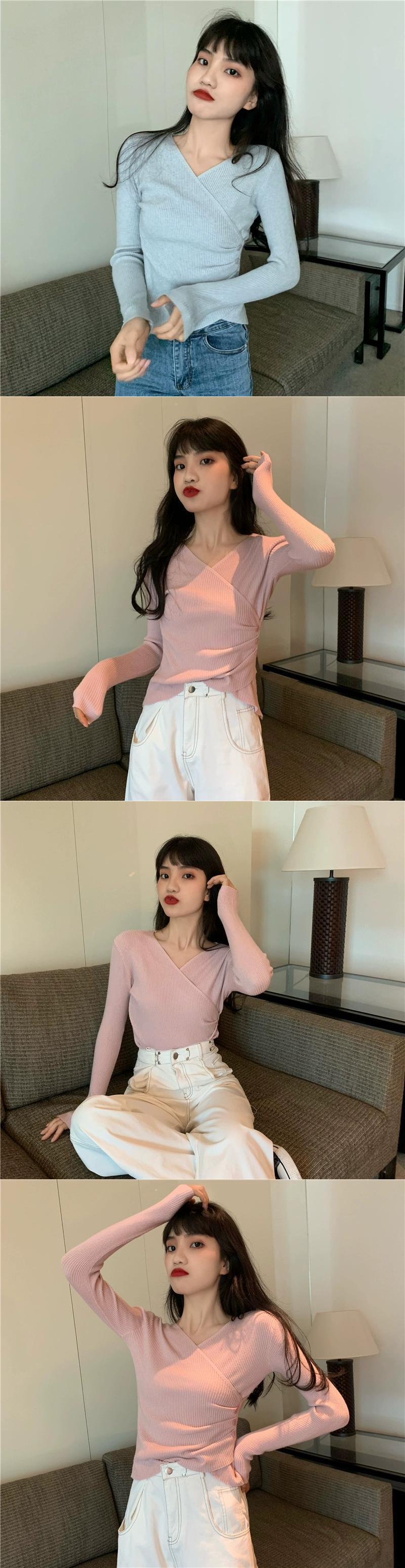 ソリッドカラーのVネック長袖インナーセーターレディース、春のデザイン、ニッチでシック、スリムフィットボトリングシャツ、セータートップ ロング スプリング 春物 berry75880923532 | beaute25