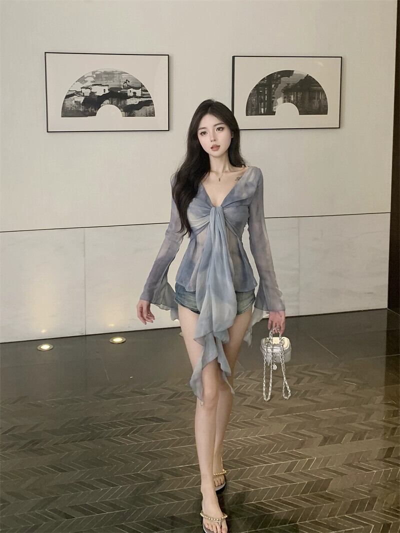 ブルー V ネック絞り染め長袖シャツ女性春の純粋な欲望スタイル細いウエスト シャツフェアリー シック シックなトップ ロング スプリング 春物 Vネック ピュア berry67283913680 | beaute25