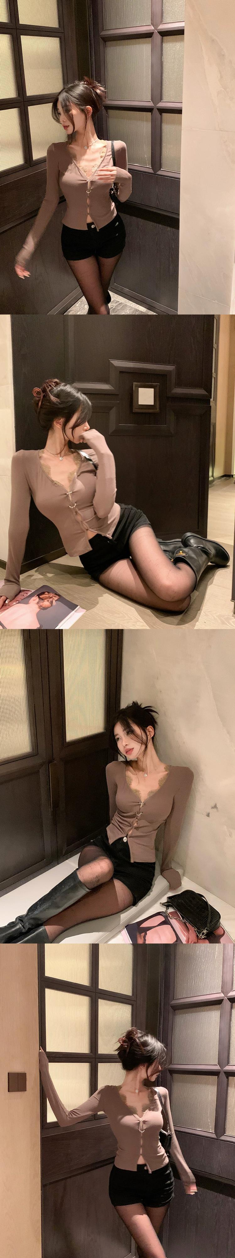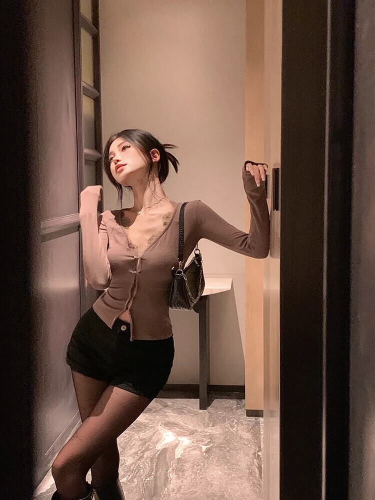 ホットセクシーなレースニットカーディガン女性の春長袖ボトムシャツ黒の V ネックスリムショートインナートップ ロング ブラック スプリング 春物 Vネック berry85333296187 | beaute25