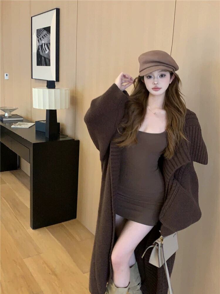 メイラードウェアブラウンラペルセーターコート女性の秋と冬の怠惰なスタイルルーズミッドレングスニットカーディガントップ オータム 秋物 ウィンター 冬物 berry20460722721 | beaute25