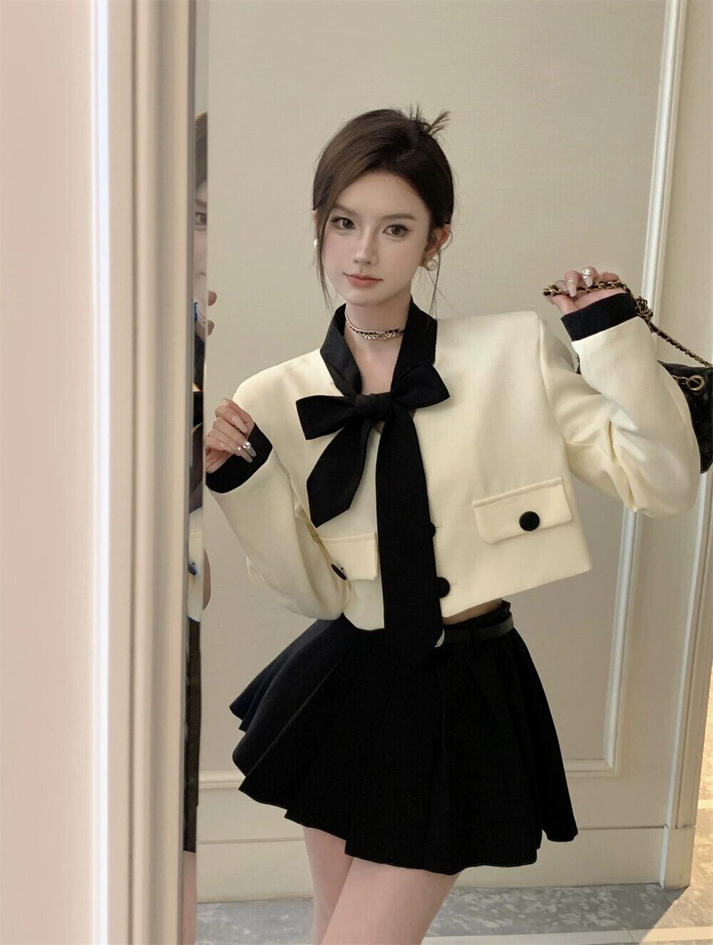 Xiaoxiang スタイルのレディスーツ女性の春長袖ショートスーツジャケットトッププリーツ JK スカート 2 点セット ロング スプリング 春物 berry2677461398 | beaute25