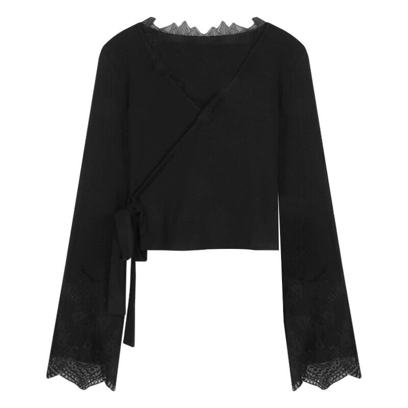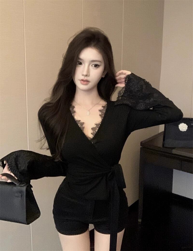 黒の V ネックレーススプライシングストラップ Tシャツ女性春ウエストタイトなセクシーな長袖インナーレイヤードシャツトップ ロング レッド ブラック スプリング 春物 Vネック berry997143804 | beaute25