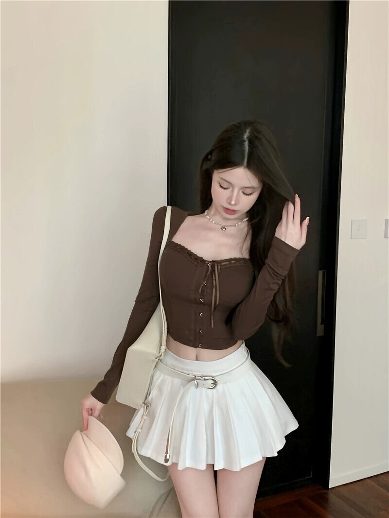 黒のスクエアネック長袖 T シャツの女性の春の純粋な欲望ショート インナー レイヤード シャツ レース超表示フィギュア トップ ロング レッド ブラック スプリング 春物 Tシャツ ピュア スクウェア berry49548695437 | beaute25