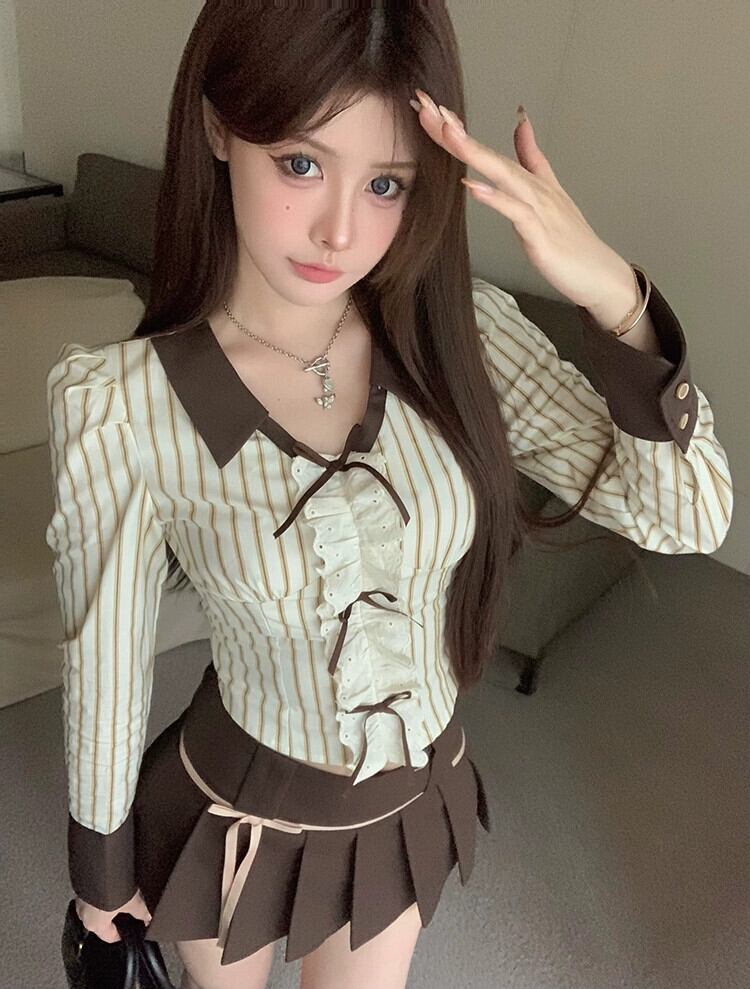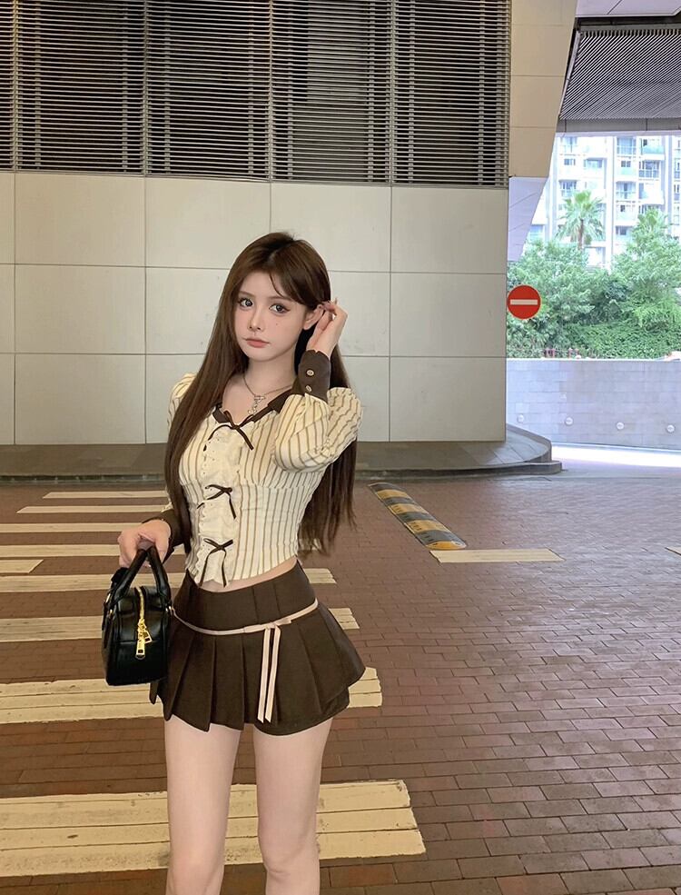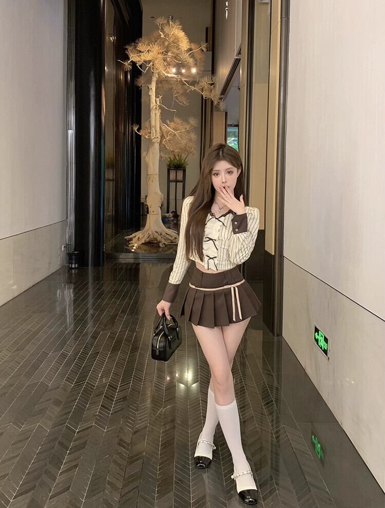 色:ベージュのストライプシャツ,ダークブラウンのキュロット