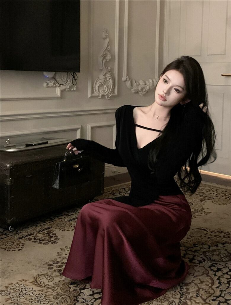レトロ純粋な欲望スタイルのハイコールドロイヤルシスターVネック長袖Tシャツレディース初春新作不規則スリットブラックスリムフィットトップ ロング スプリング 春物 ピュア berry58821917771 | beaute25