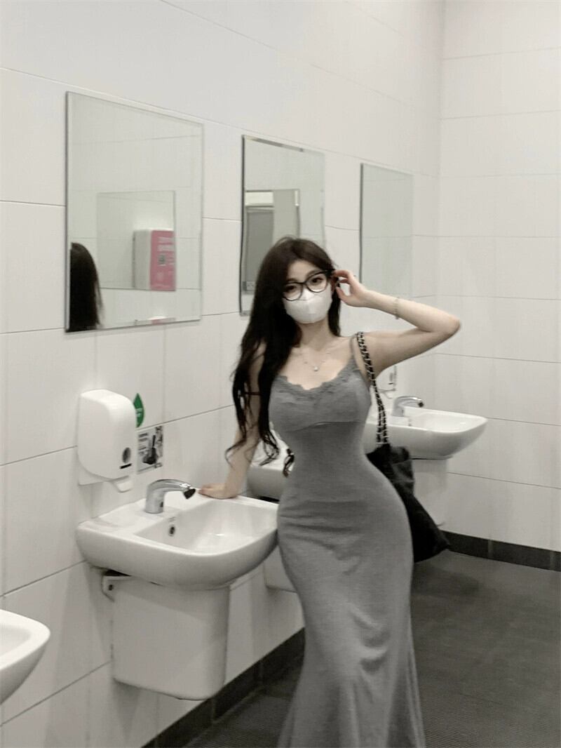 グレーの V ネック サスペンダー ドレス レディース、春のレース スプライシング インナー スカート、スリム ウエスト、ヒップを包み込むロング スカート ママ スプリング 春物 Vネック berry16735684649 | beaute25