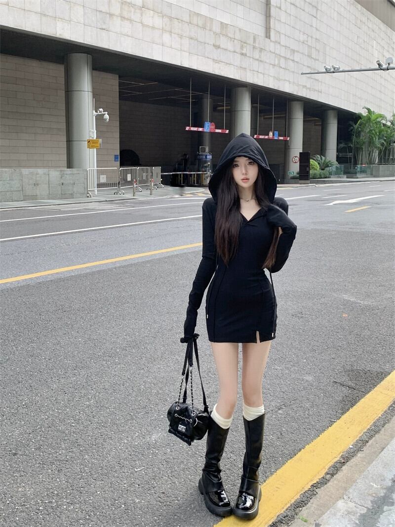 純粋な欲望スタイル長袖フード付き巾着ドレス女性の秋と冬グレースカートウエストタイトヒップハグショートスカート ロング オータム 秋物 ウィンター 冬物 berry66462404960 | beaute25