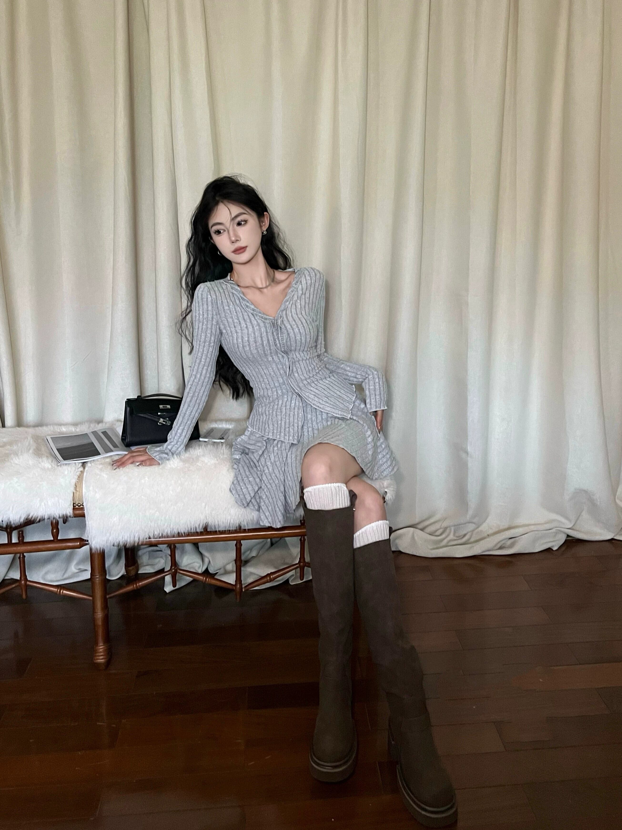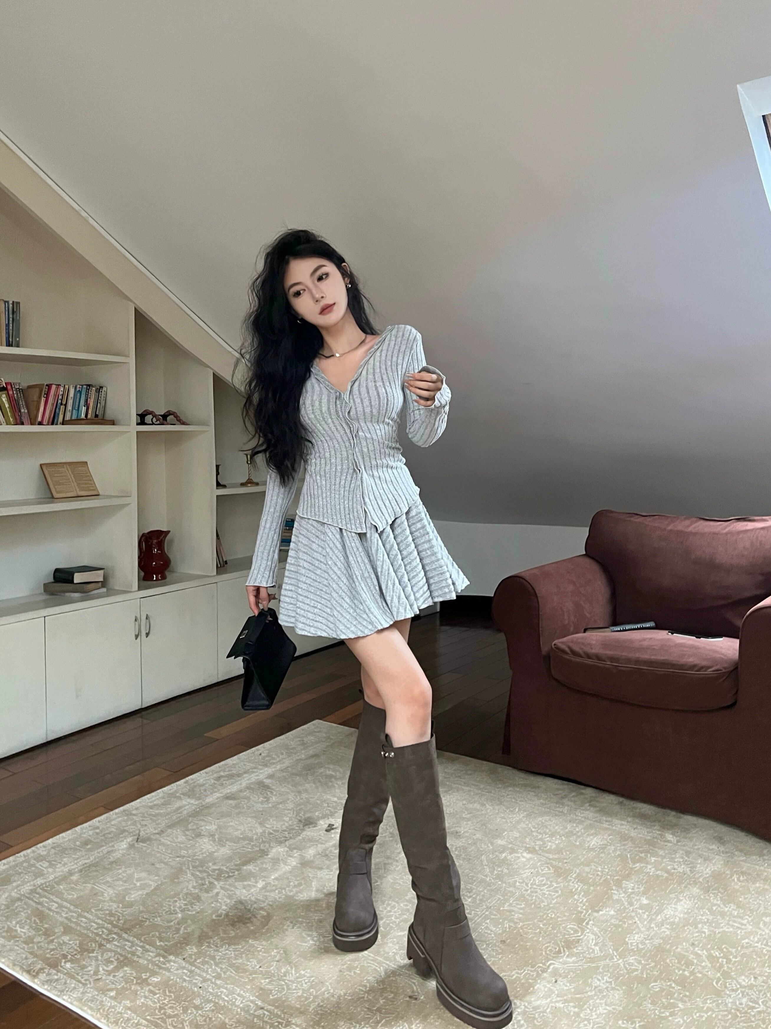 グレーの V ネック長袖ニット カーディガン トップ、イヤリング付きレディース、秋と春のスーツ スカート、A ライン スカート 2 点セット ロング スプリング 春物 オータム 秋物 Vネック Aライン 指輪 berry75579681868 | beaute25