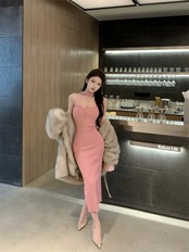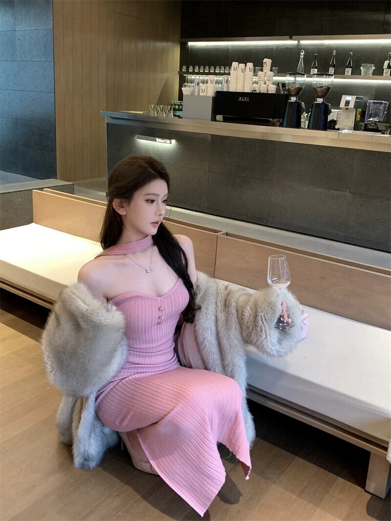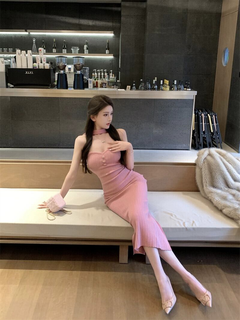Pure Desire ホルターネック チューブブラ ニットドレス レディース 夏 ウエストバッグ ヒップスカート ピンク スリム ミドル丈 スリットスカート サマー 夏物 berry14617211584 | beaute25