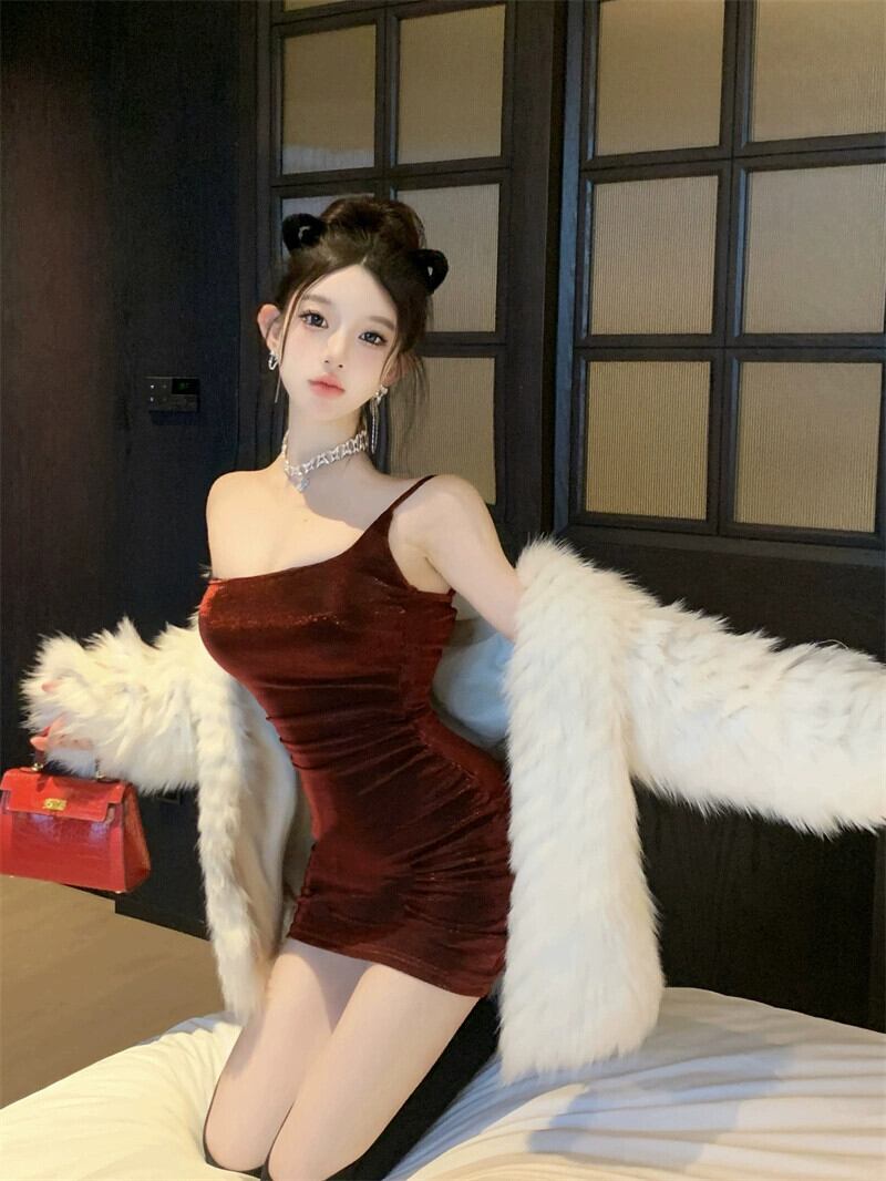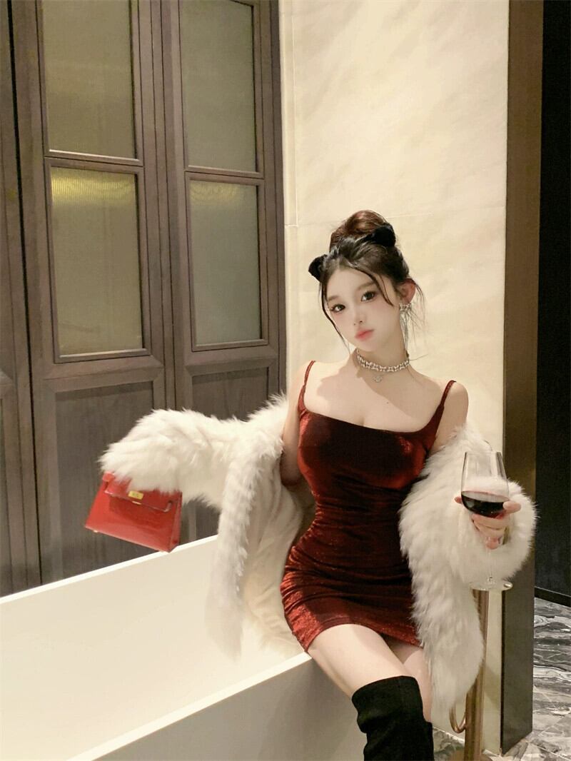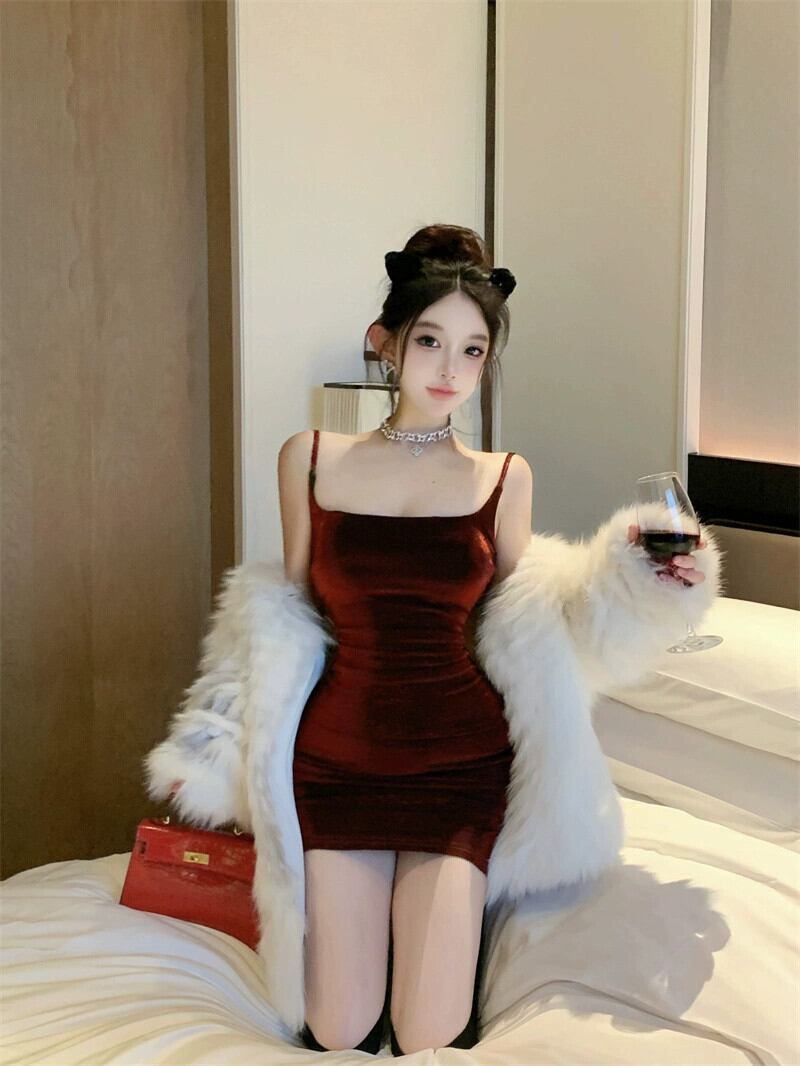 光沢のある赤いベルベットのサスペンダードレス女性の春のセクシーなネクタイタイトなインナースカートとヒップハグショートスカート レッド スプリング 春物 berry43764595482 | beaute25