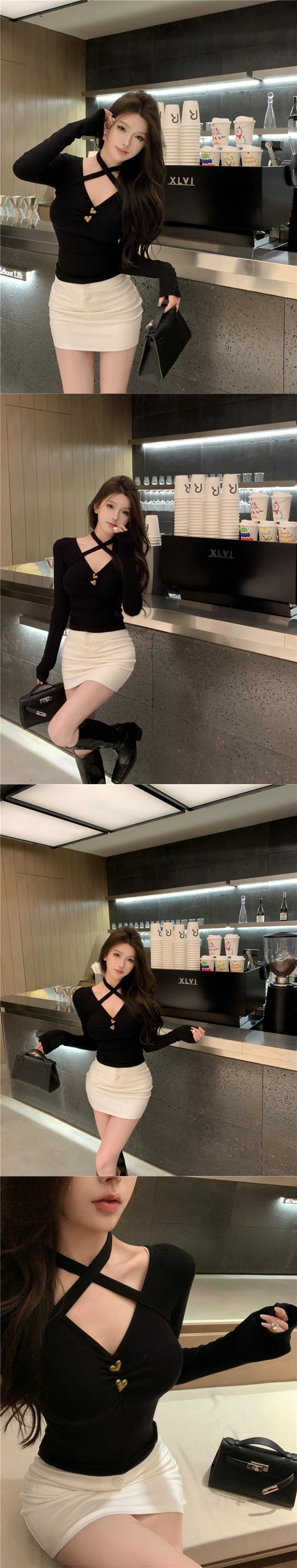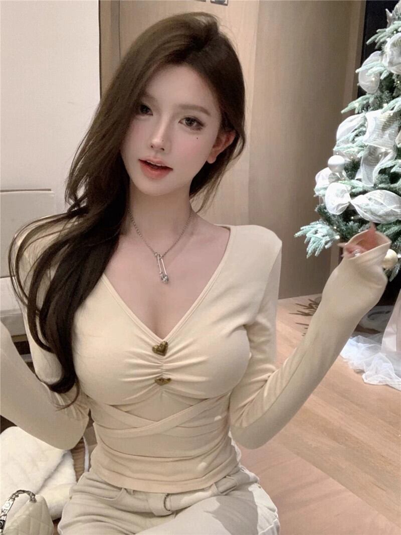 V ネックボトリングシャツ長袖 Tシャツレディース春純粋な欲望セクシーなウエストスリムタイトショートスタイルグレートップ ロング スプリング 春物 Vネック ピュア berry50811190018 | beaute25
