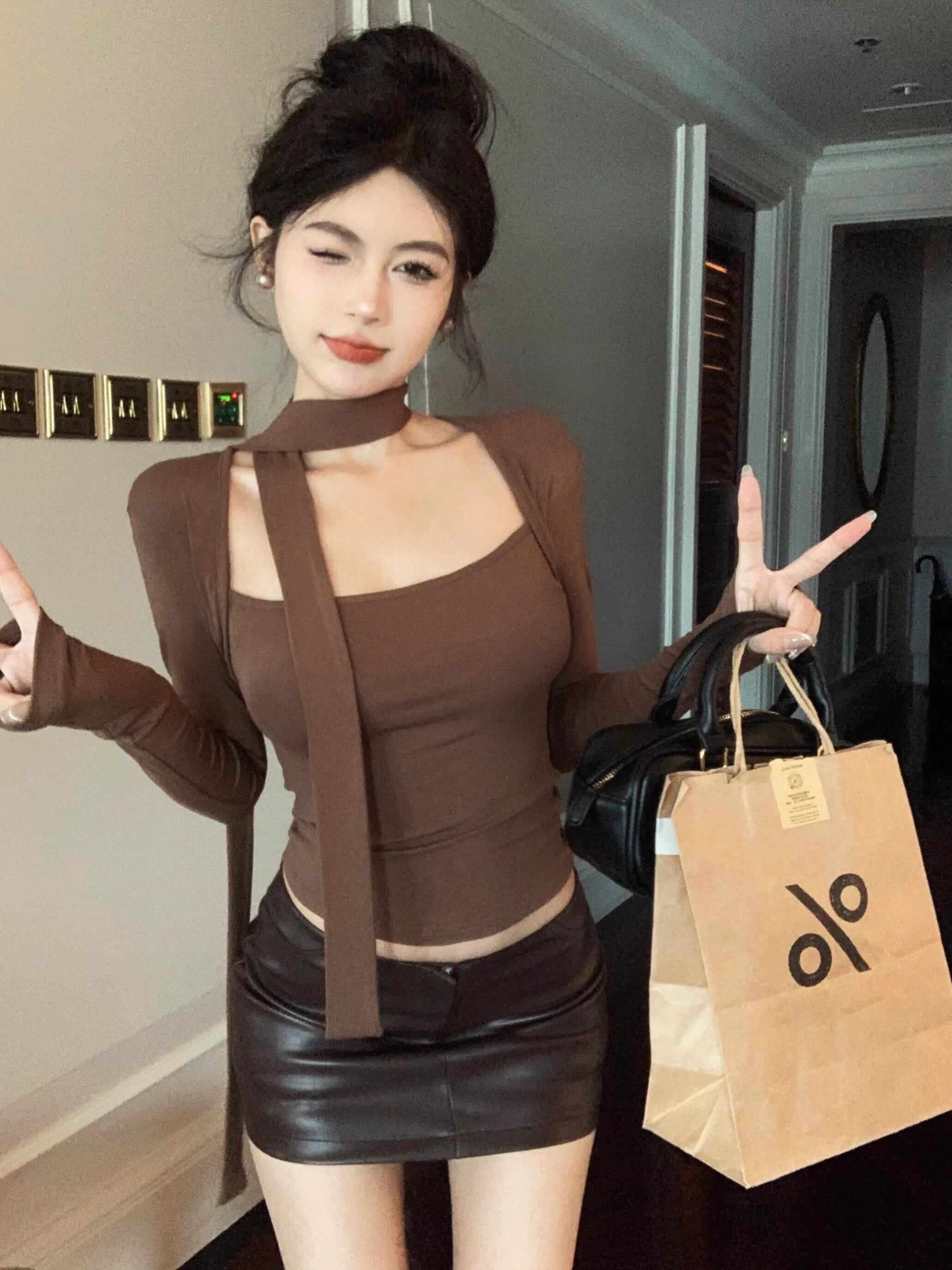 色:ブラックトップ,コーヒートップ,黒革のスカート,コーヒー色のレザースカート