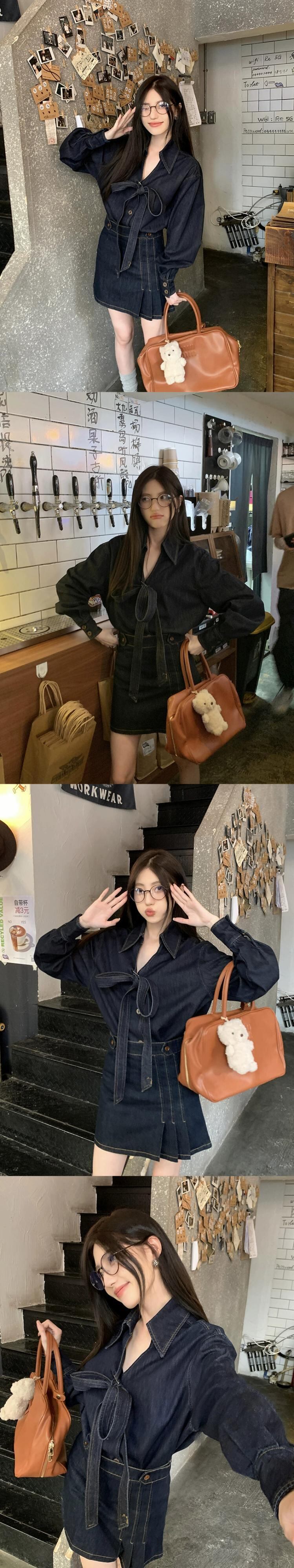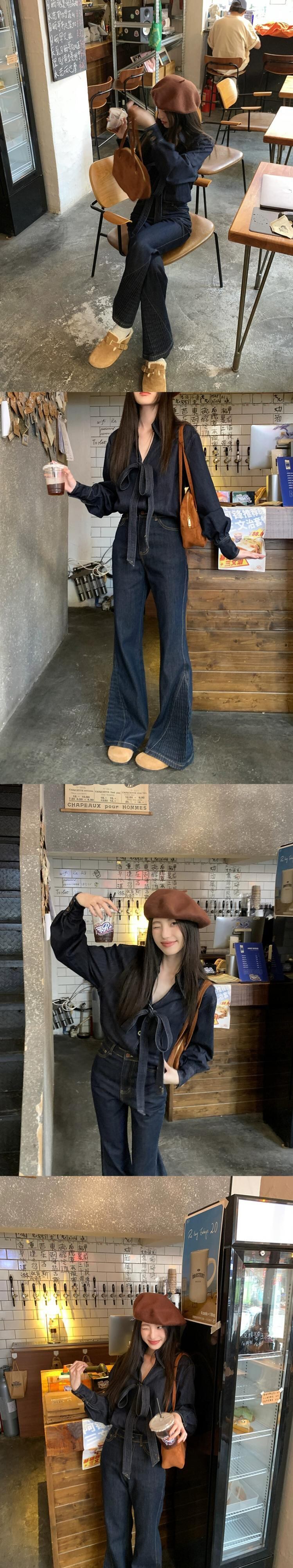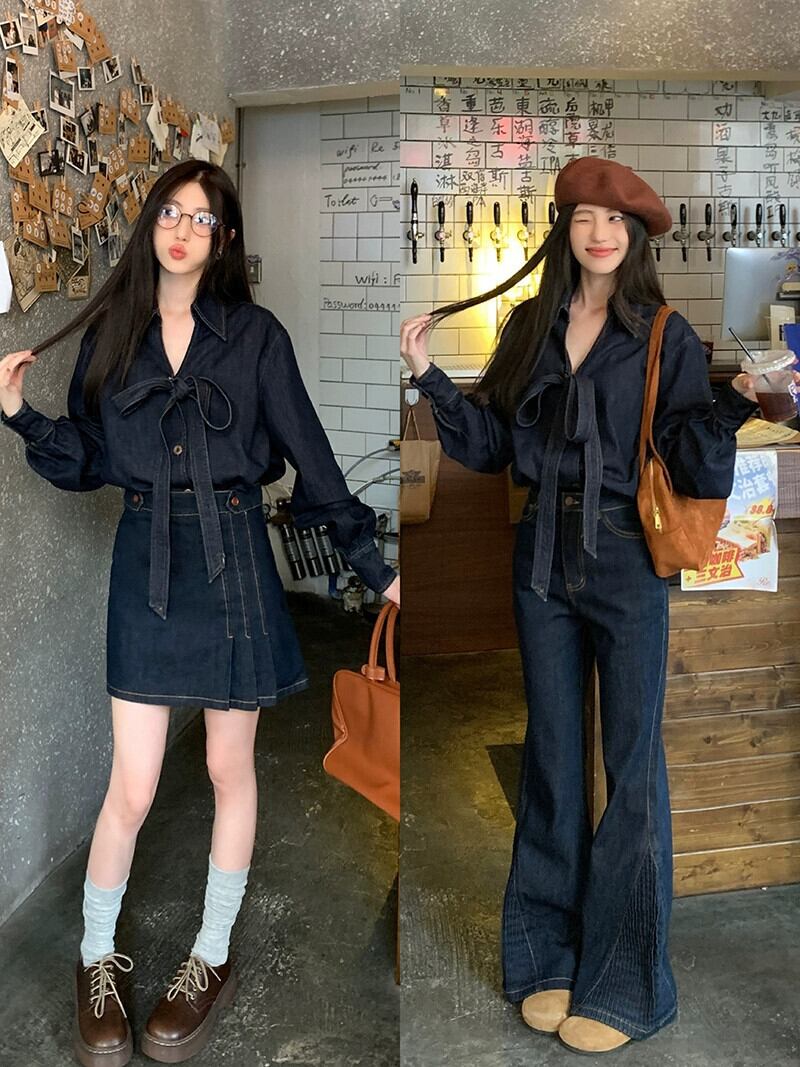 香港風レトロデニムスーツボウシャツトップレディース春先ハイウエストややフレアパンツズボン2点セット ハイウェスト レッド リボン スプリング 春物 berry15134614686 | beaute25