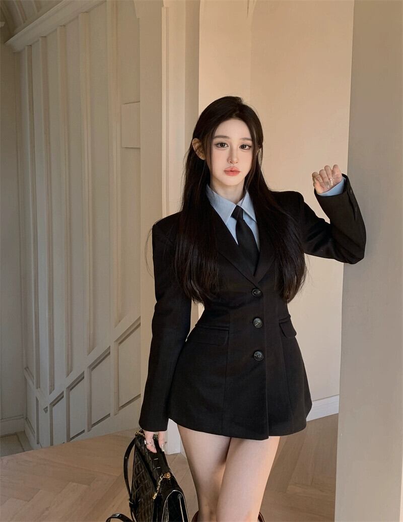 色:ネクタイ付きシャツ,黒のショートパンツ,黒いジャケット