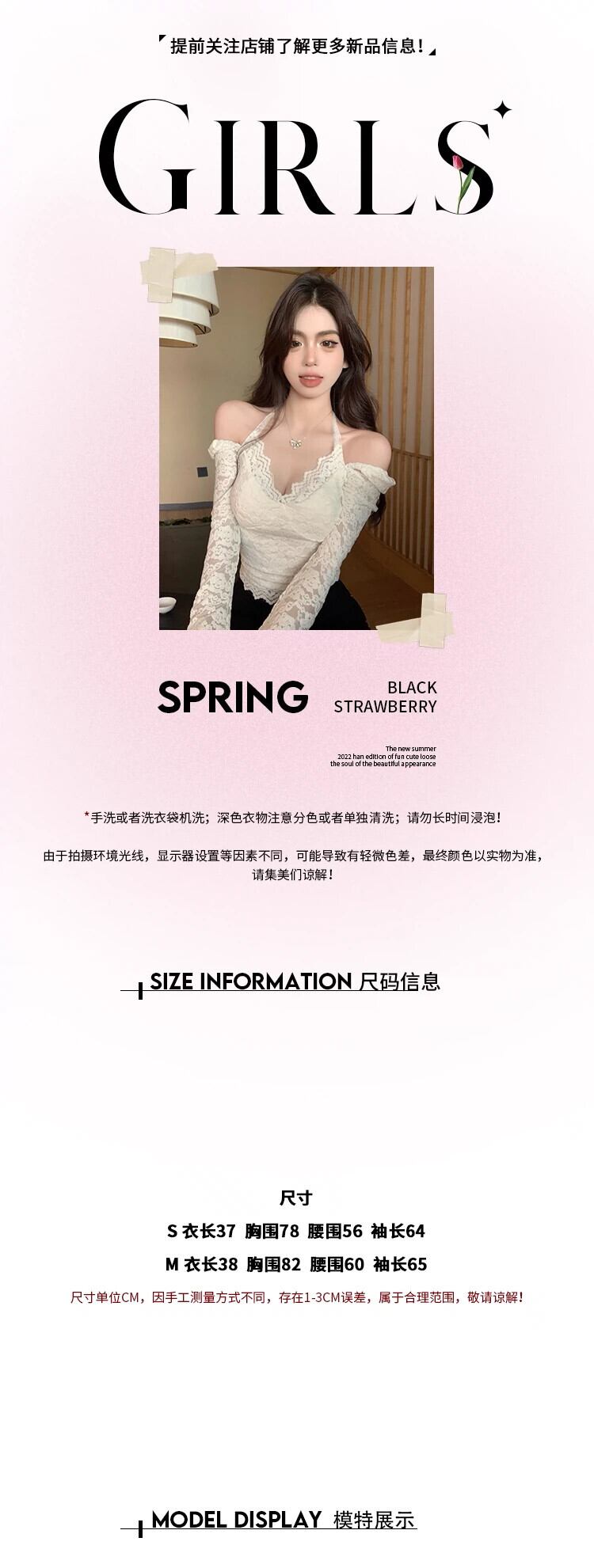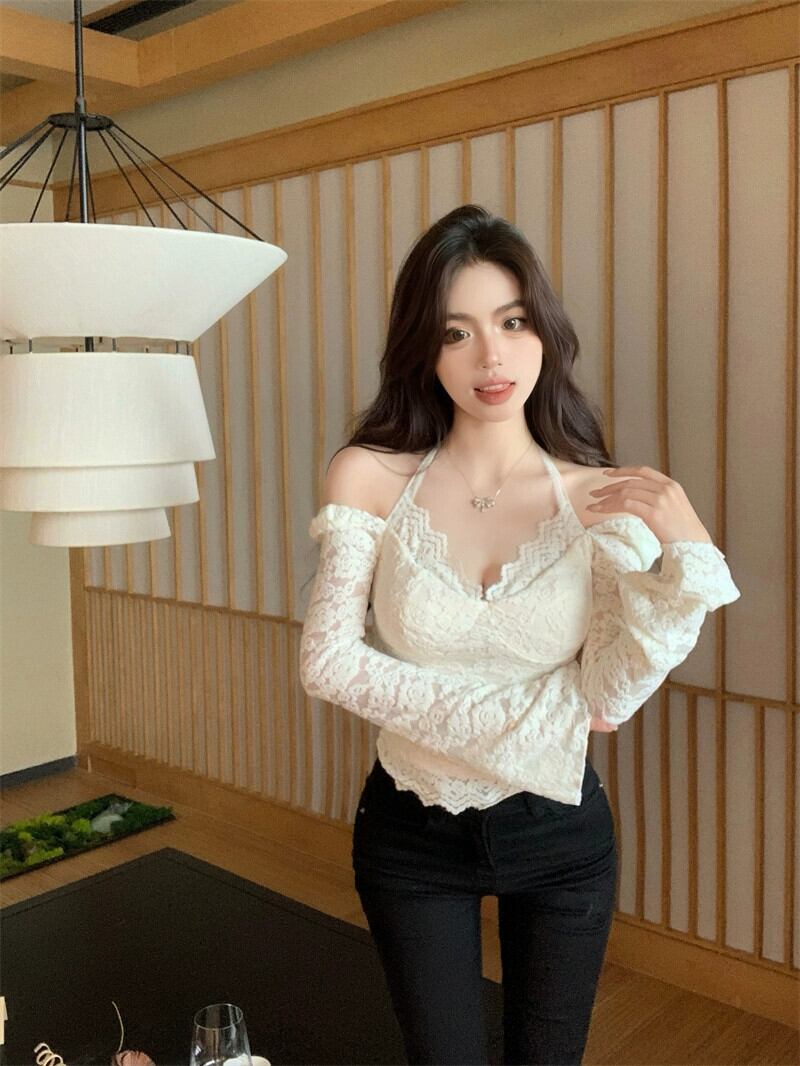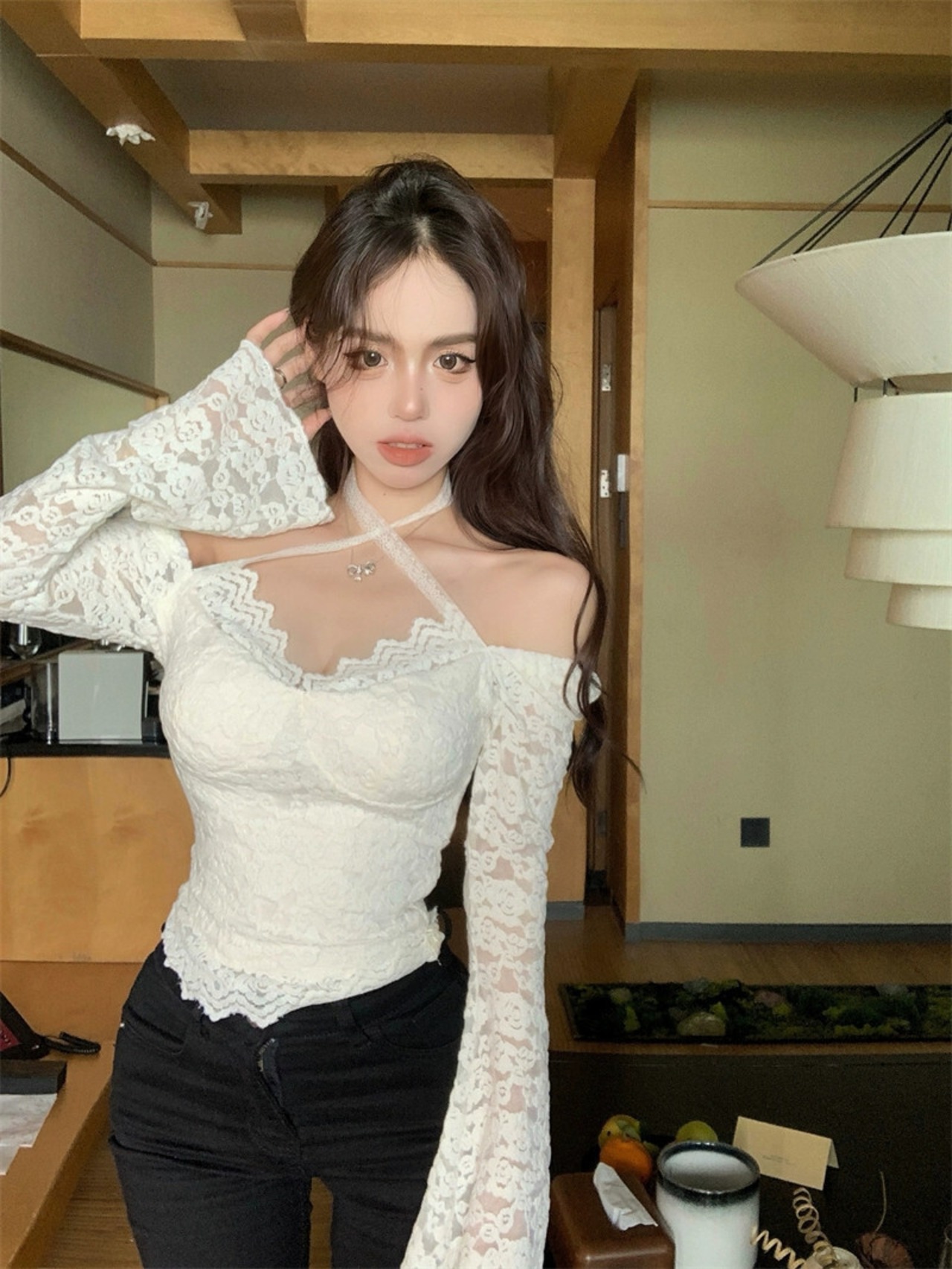 アプリコット長袖ホルターネックレースボトリングシャツ女性春純粋な欲望セクシーなスリムショートオフショルダーインナートップ ロング スプリング 春物 ピュア berry69141346929 | beaute25