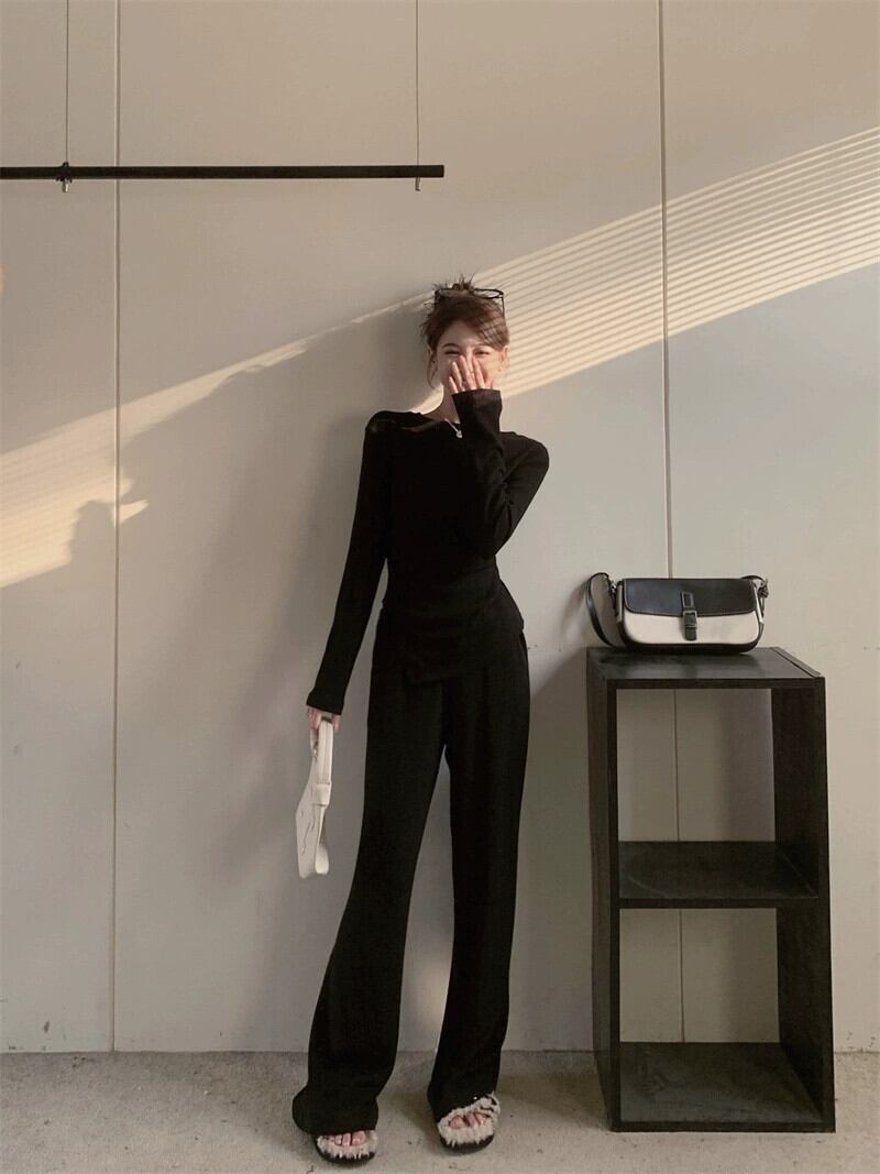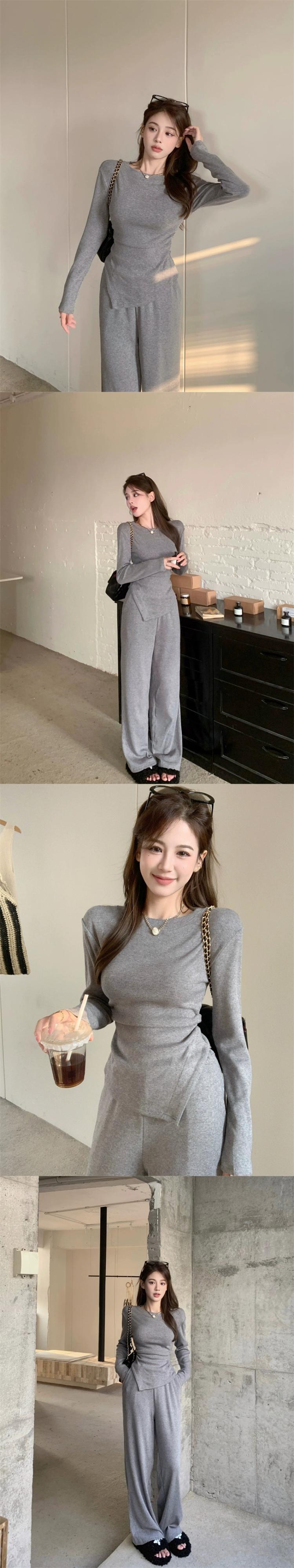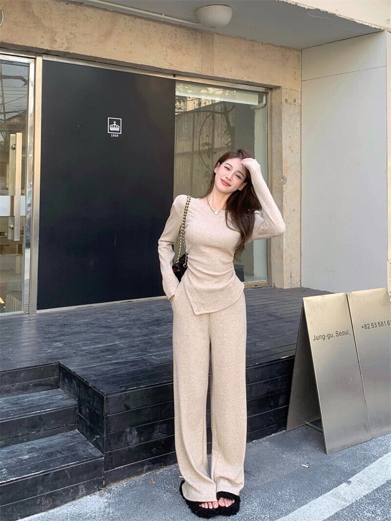 長袖ラウンドネックTシャツ、変則プリーツウエストトップス、レディース春カジュアルスーツ、ワイドパンツ2点セット ロング スプリング 春物 Oネック berry81321685275 | beaute25