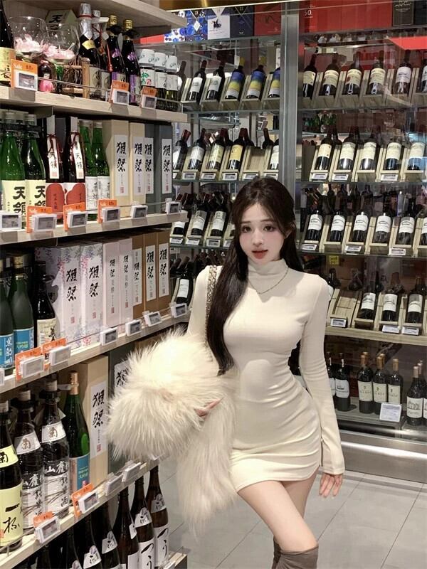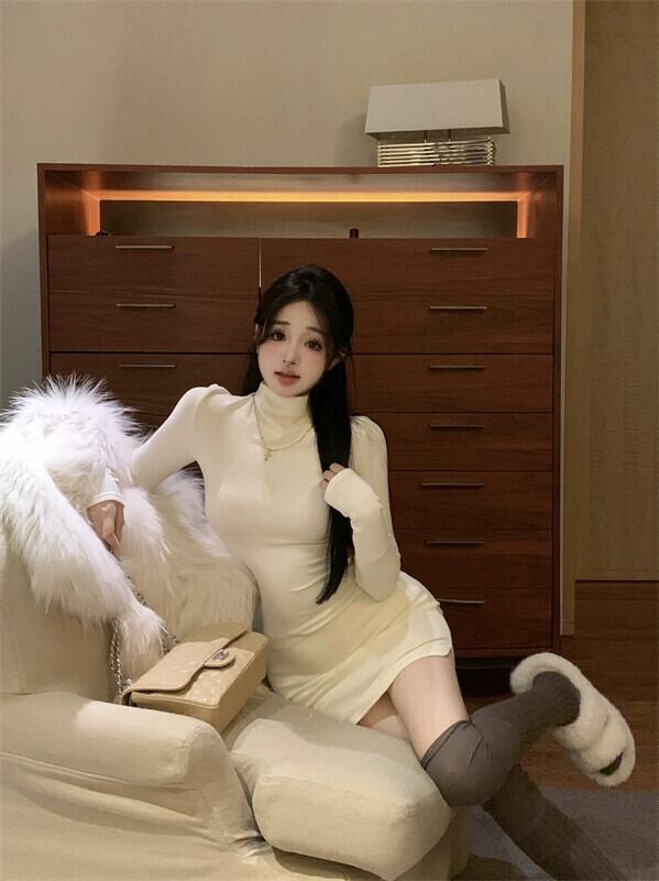 白いタートルネック長袖ドレスの女性の春の純粋な欲望スタイルのセクシーなタイトなヒップハグショートスカートとボトリングスカート ロング ホワイト スプリング 春物 ピュア berry39856793622 | beaute25