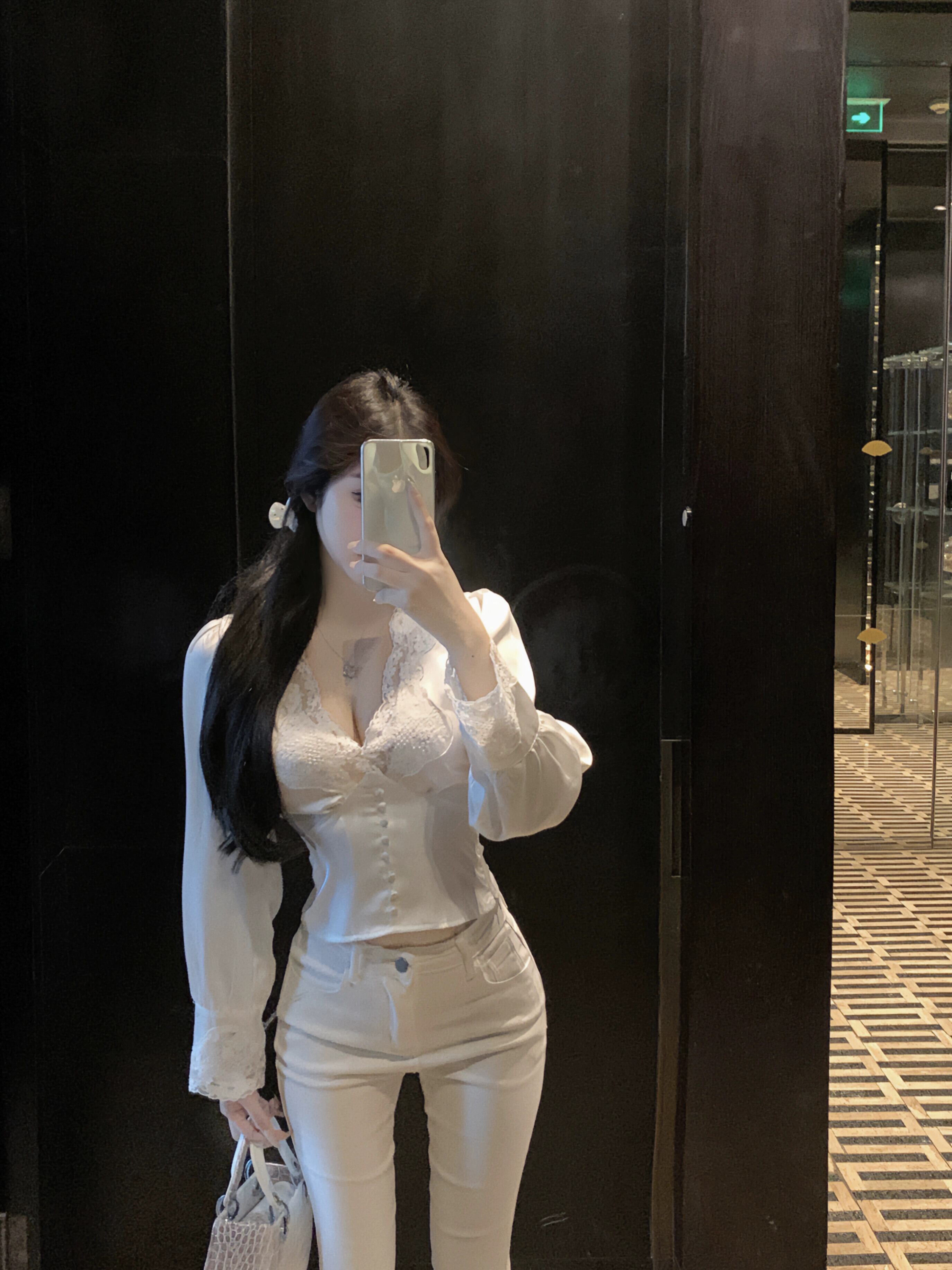 レーススプライシングシャツ女性の春 V ネック長袖シャツフレンチホワイトアセテートサテンハイエンドウエストトップ ロング スプリング 春物 Vネック berry41705163568 | beaute25