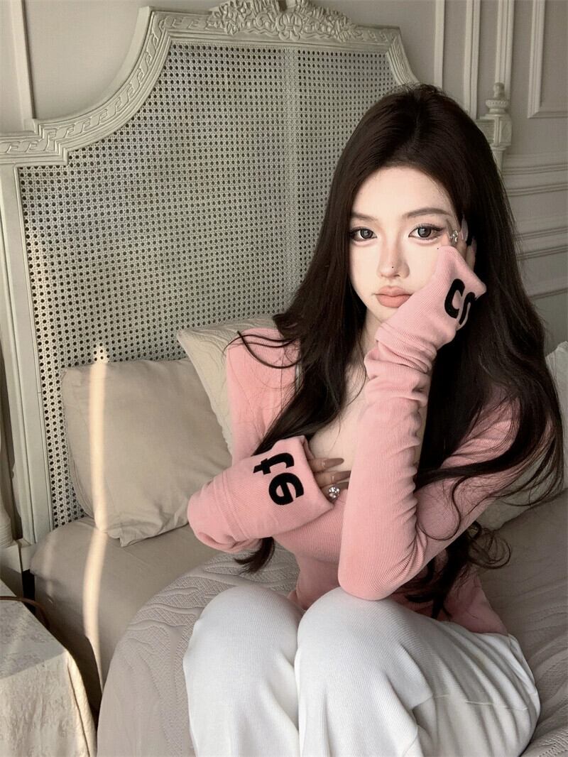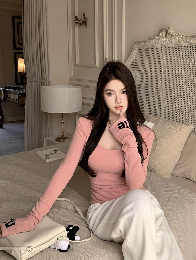 シックでユニークな女性用トップス、デザイナー長袖 U ネック T シャツ、春のピンク、スリムフィット、ローネックのインナー ボトム シャツ ロング スプリング 春物 Tシャツ berry33922683678 | beaute25
