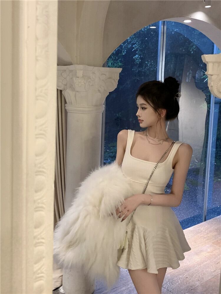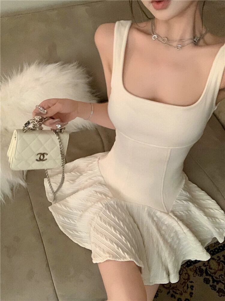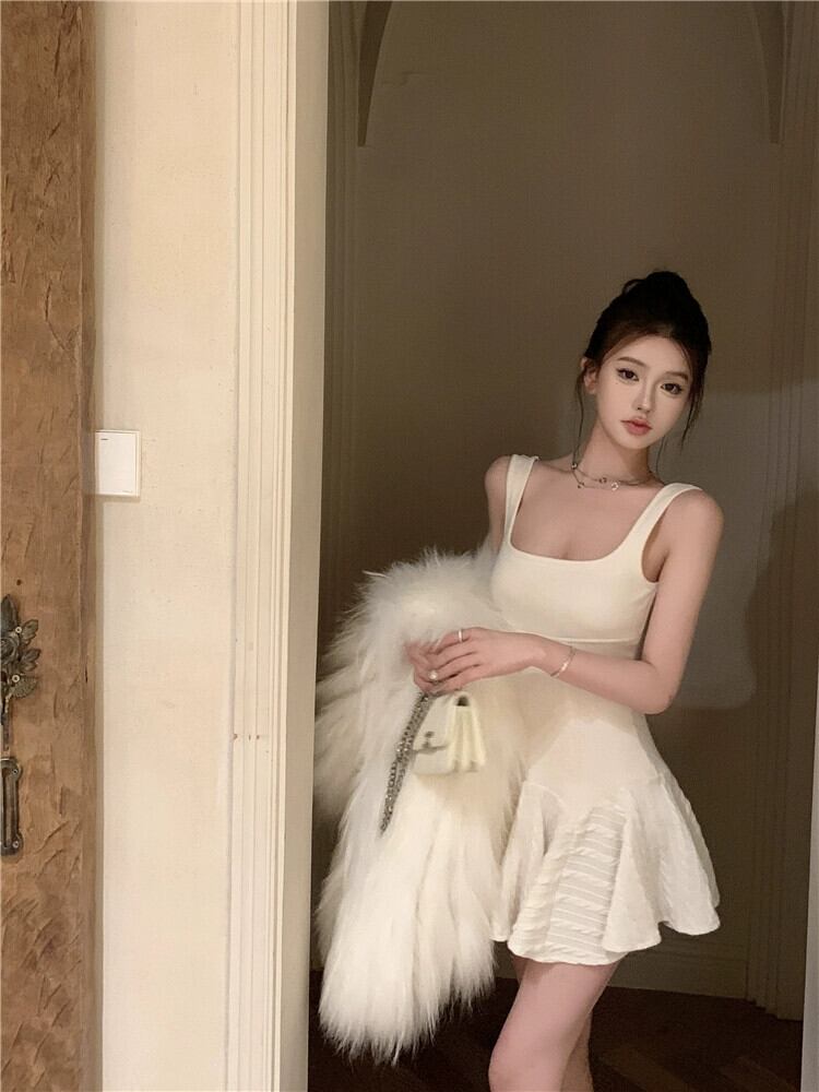 夏の白いサスペンダードレスの女性、純粋な欲望のスタイル、バレエスタイルのスプライシングスカート、フィッシュボーンウエスト、ふわふわのAラインスカート ホワイト サマー 夏物 ピュア berry86179042031 | beaute25
