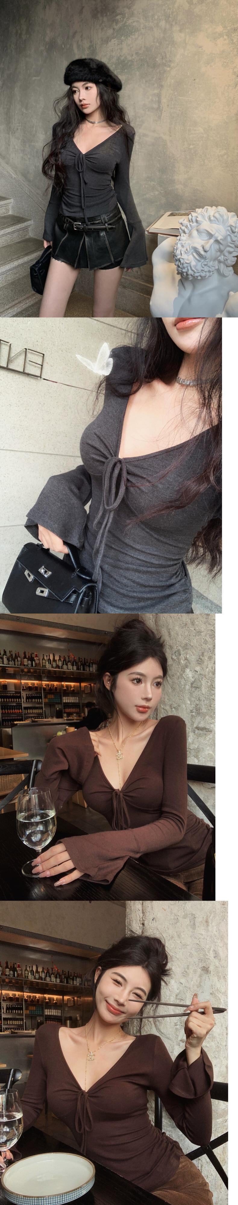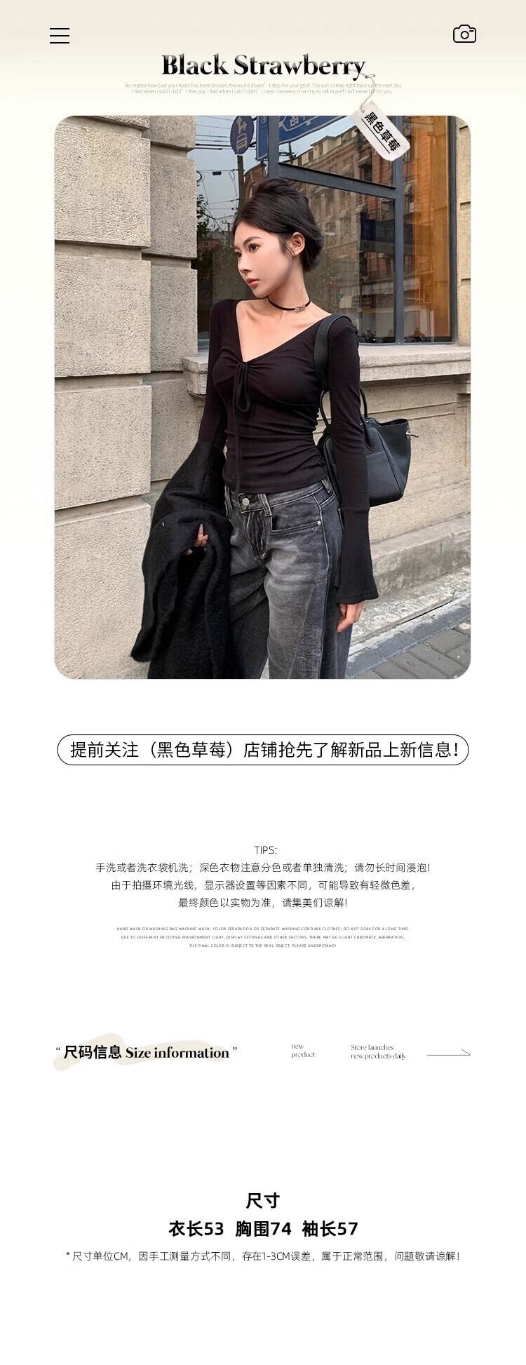 プリーツレースアップ V ネック長袖インナー Tシャツ女性春の新ベルスリーブウエスト黒底シャツシックなトップ ロング ブラック スプリング 春物 Vネック berry58234809385 | beaute25
