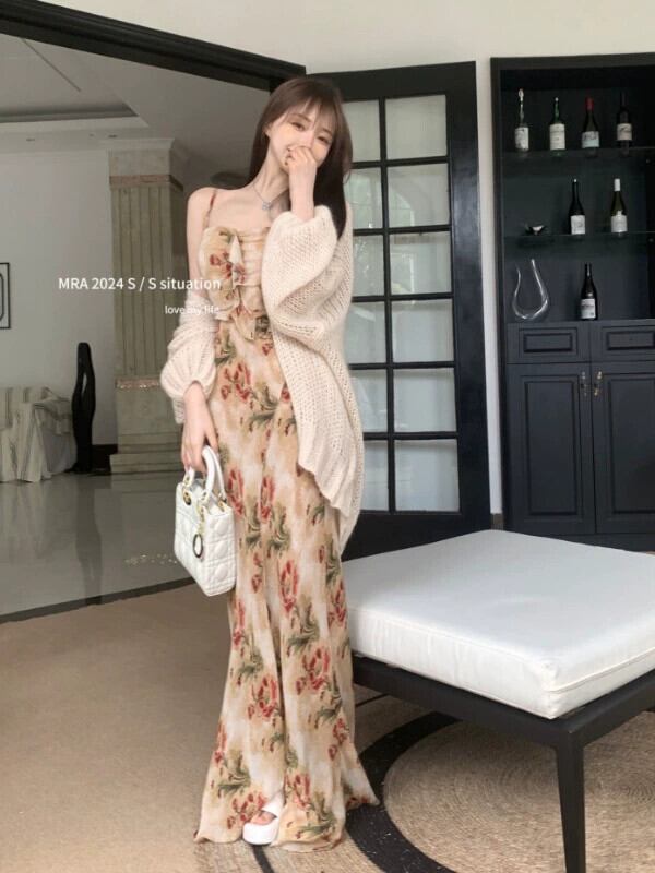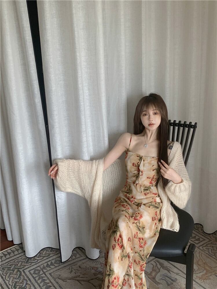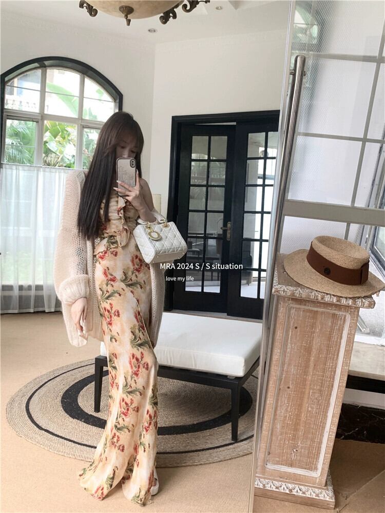 春のお茶休憩中のフランスの花柄サスペンダー ドレスの女性、そよ風、ウエストを締めるミドル丈、ヒップにぴったりとフィットする美しいスリット スカート スプリング 春物 berry5998434943 | beaute25