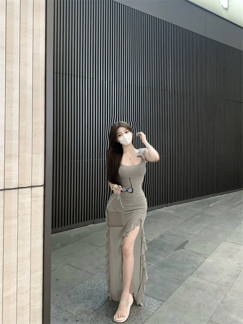 純粋な欲望スタイルのスリット サスペンダー ドレスの女性の夏の甘いネクタイと小さなフライング スリーブとウエストメッシュ スカート不規則なロング スカート 大人ガーリー スウィート キュート カジュアル サマー 夏物 berry23587210360 | beaute25