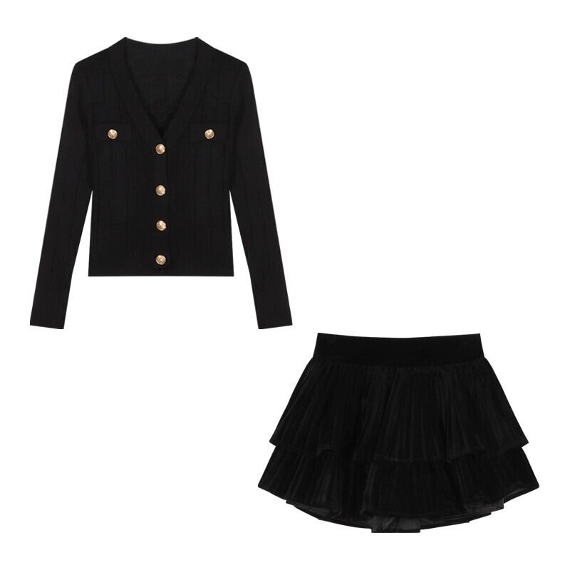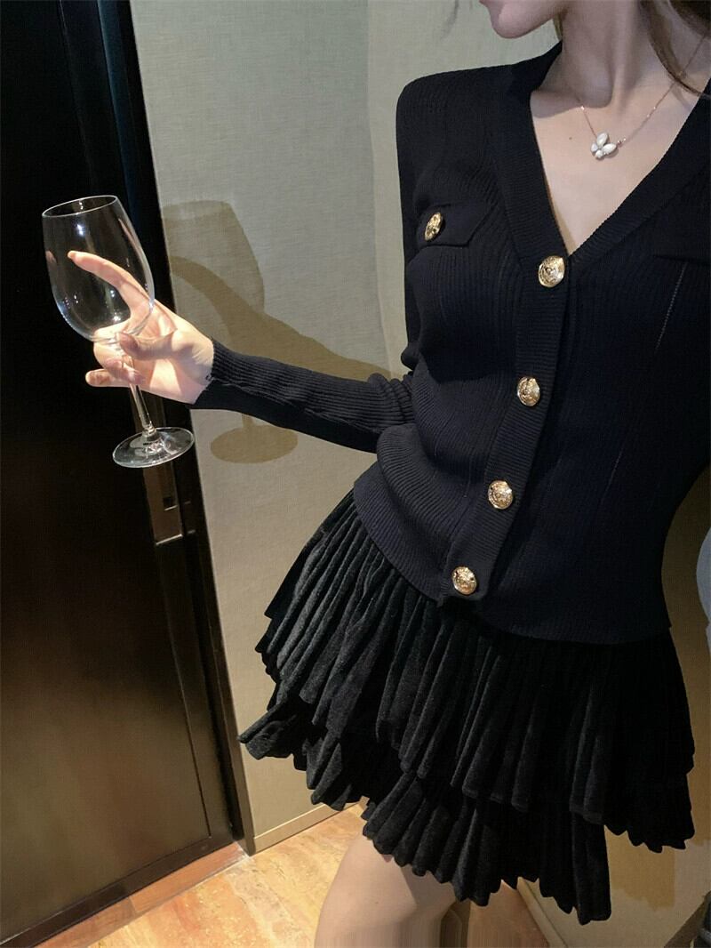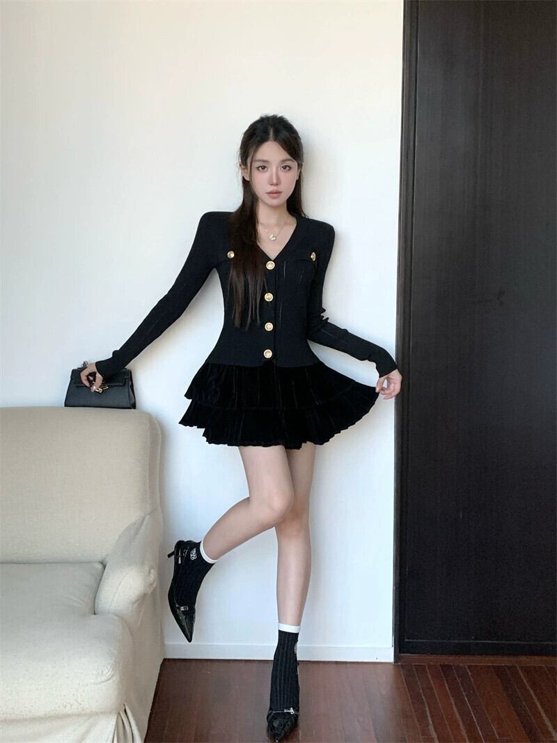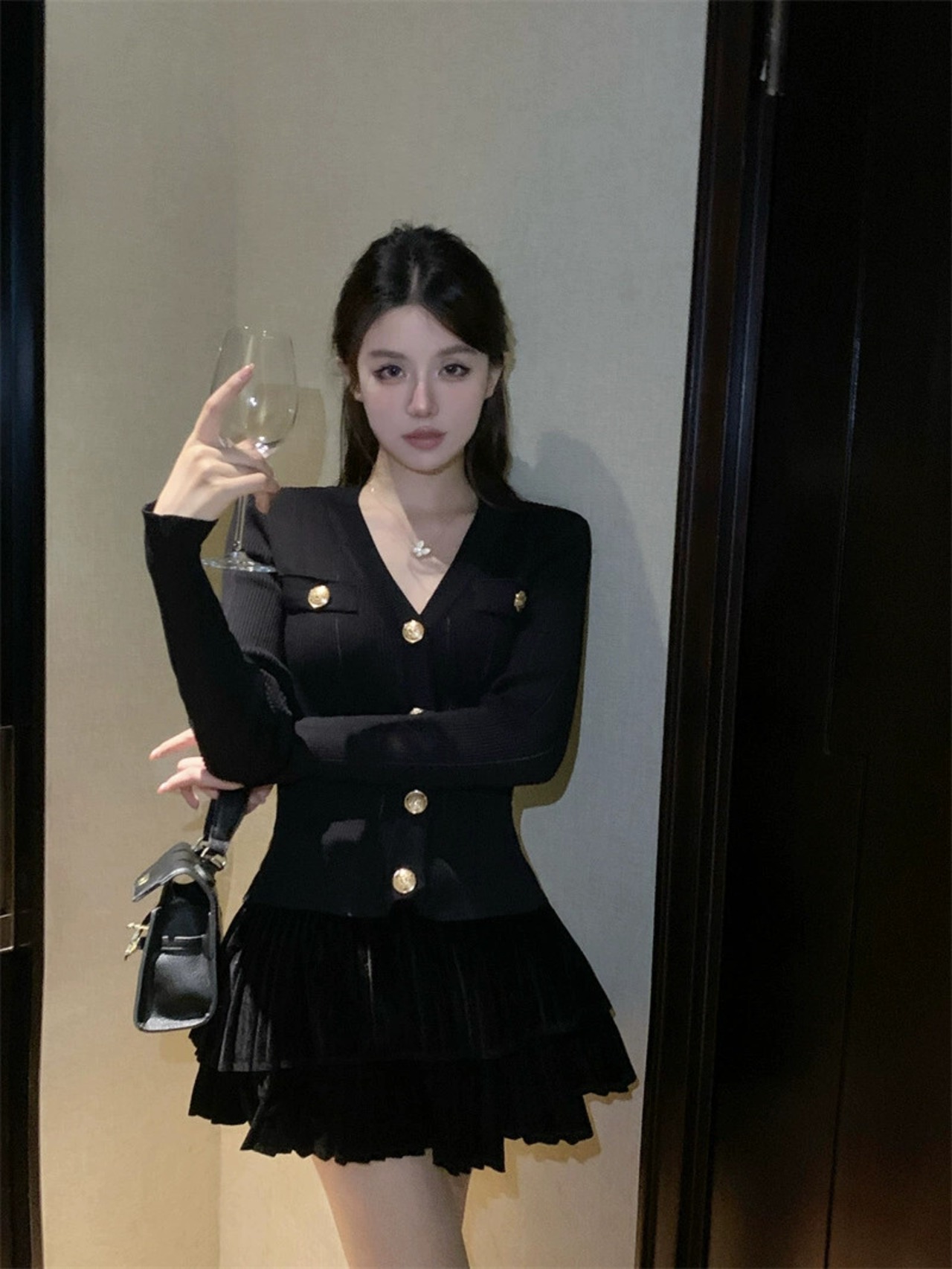 黒の小さな香りのよい V ネックニットカーディガン女性早春 2024 新しい長袖スリムセーターとショートトップ ロング ブラック スプリング 春物 Vネック berry7140241618 | beaute25
