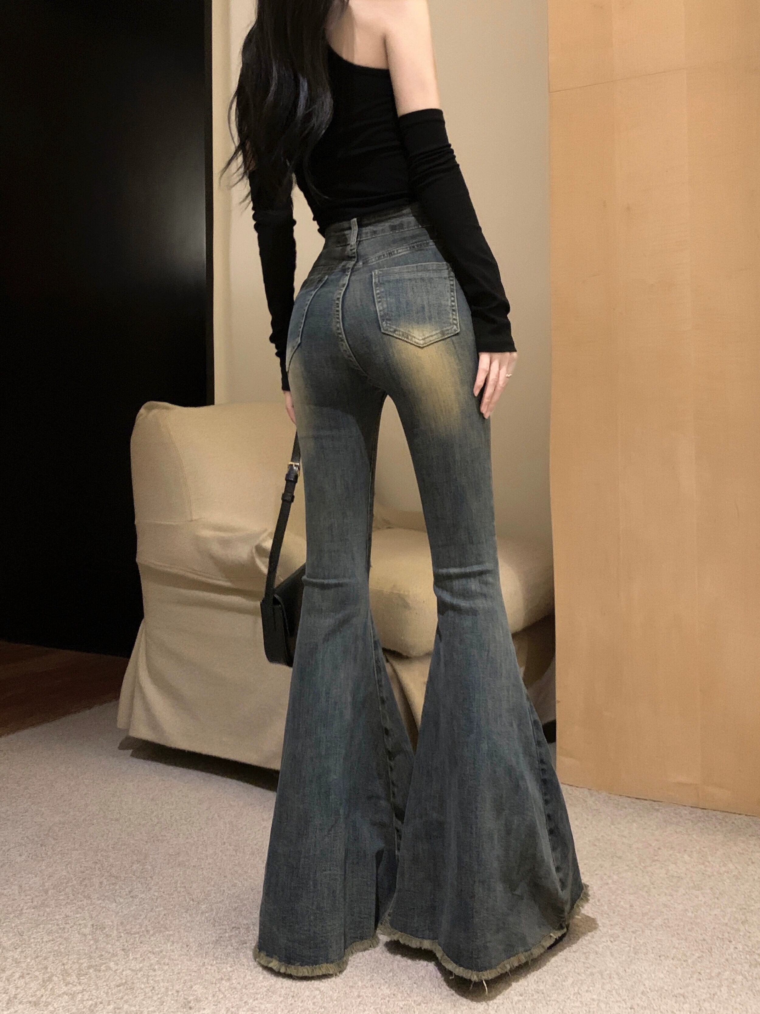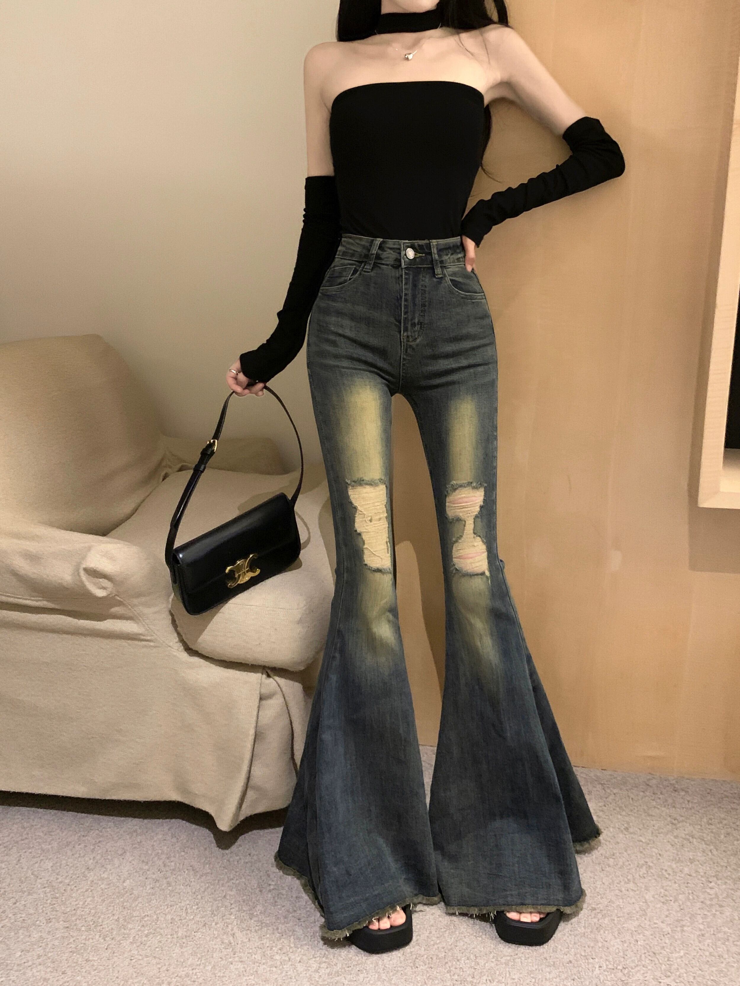 レトロな切りっぱなしエッジのリップド マイクロ フレア ジーンズ、春の女性、小さい、ハイウエスト、スリム ストレート パンツ、床までの長さのズボン スプリング 春物 berry60144071842 | beaute25