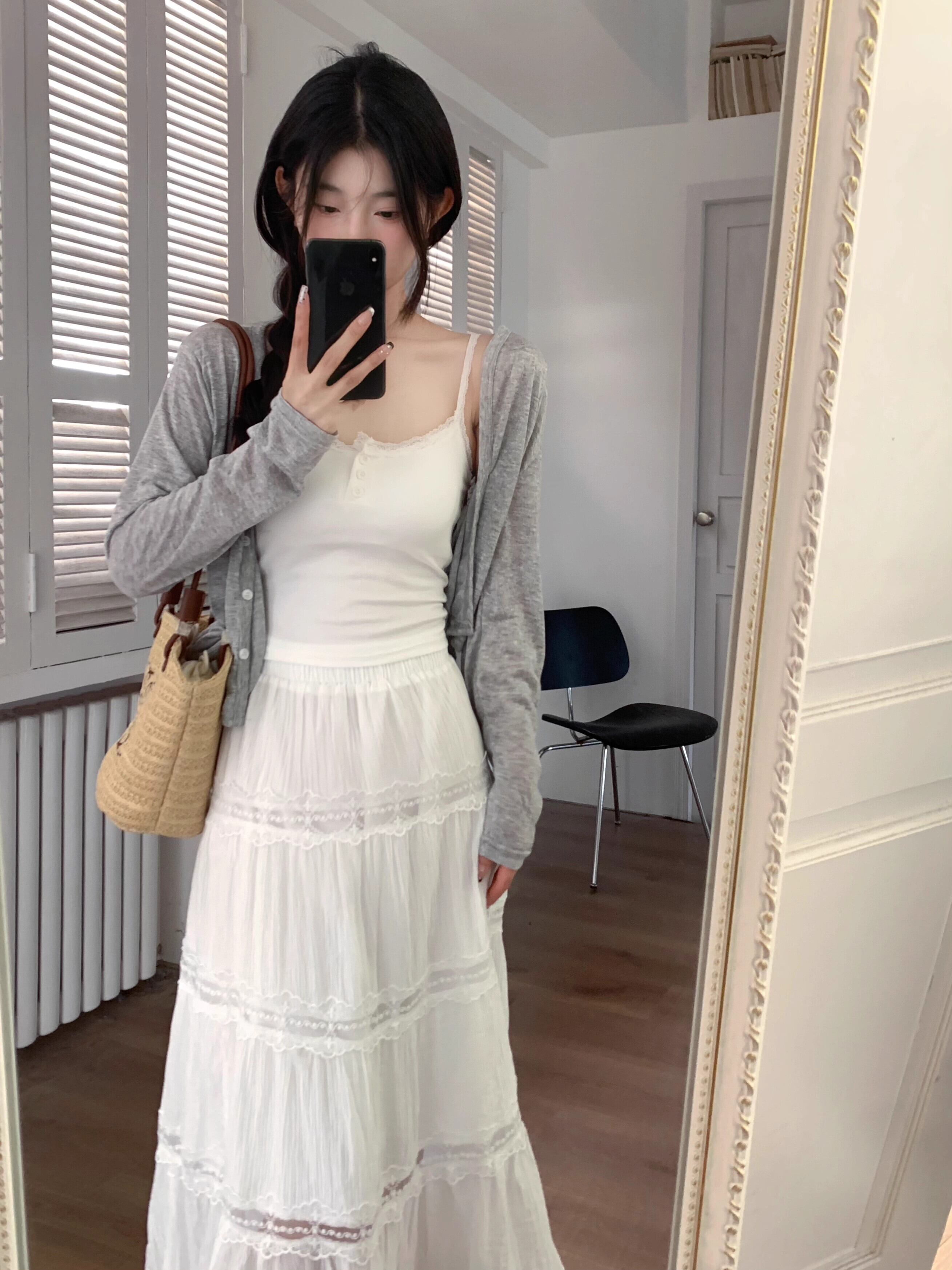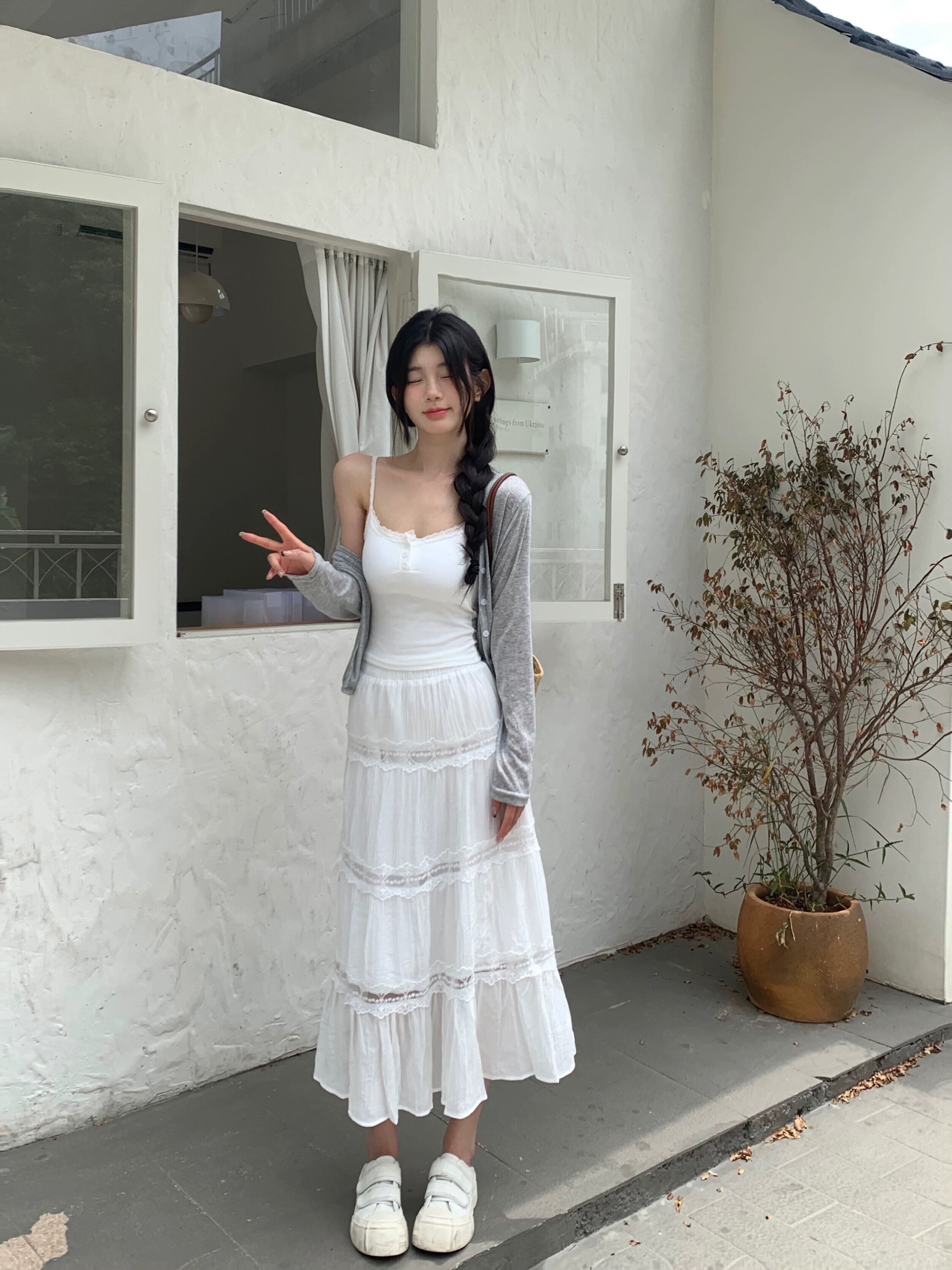 色:グレーのカーディガン,ホワイトサスペンダー,白いスカート