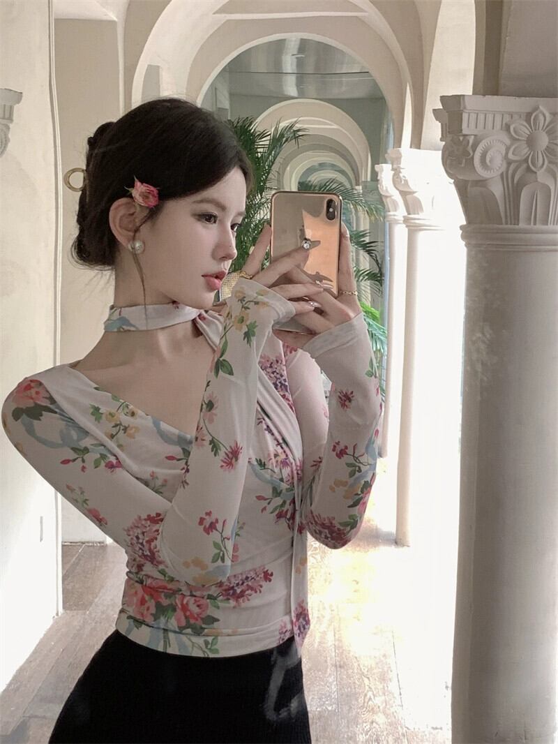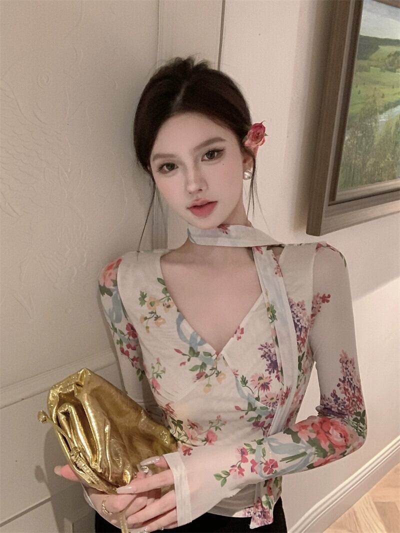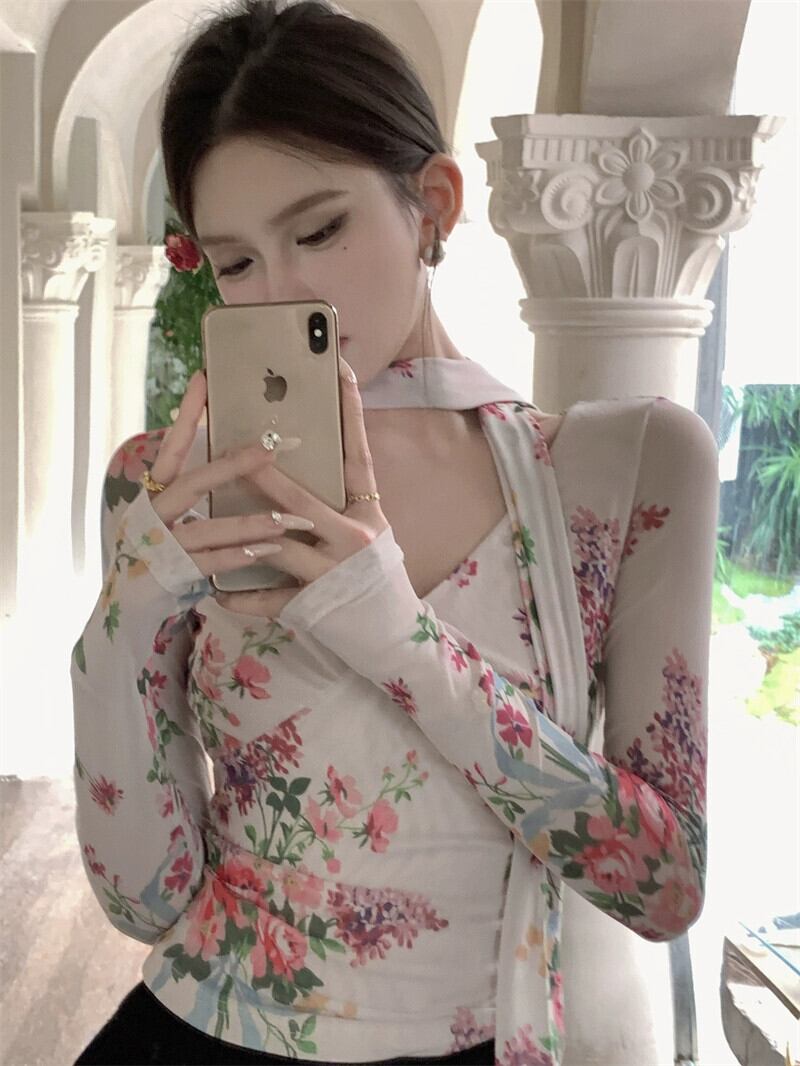 フレンチレトロ V ネック長袖プリントメッシュ T シャツレディース夏スリムフィットショートシックで美しい日焼け止めトップ ロング サマー 夏物 Vネック Tシャツ berry75192494262 | beaute25