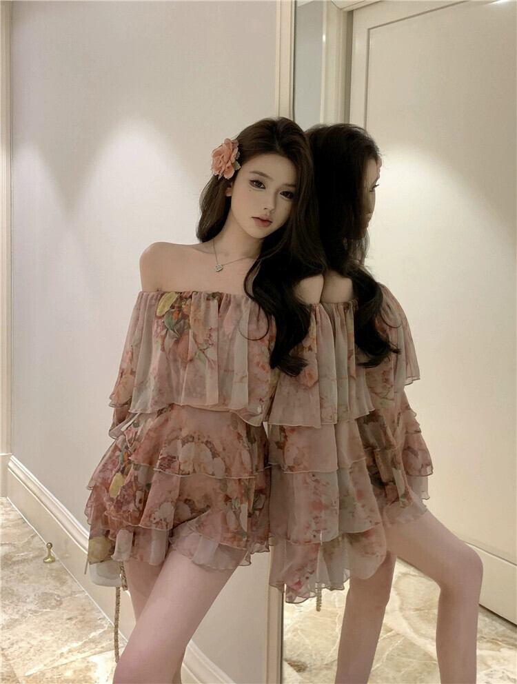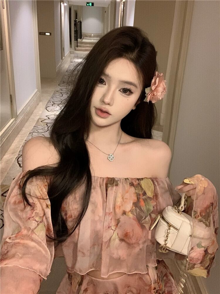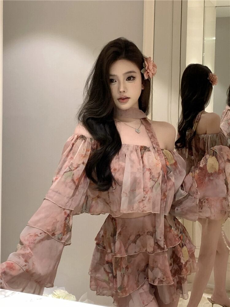 フレンチ花柄ワンショルダーシフォンシャツトップスレディース春甘く優しいスーツふくらみスカート2点セット 大人ガーリー スウィート キュート カジュアル スプリング 春物 berry52826724971 | beaute25